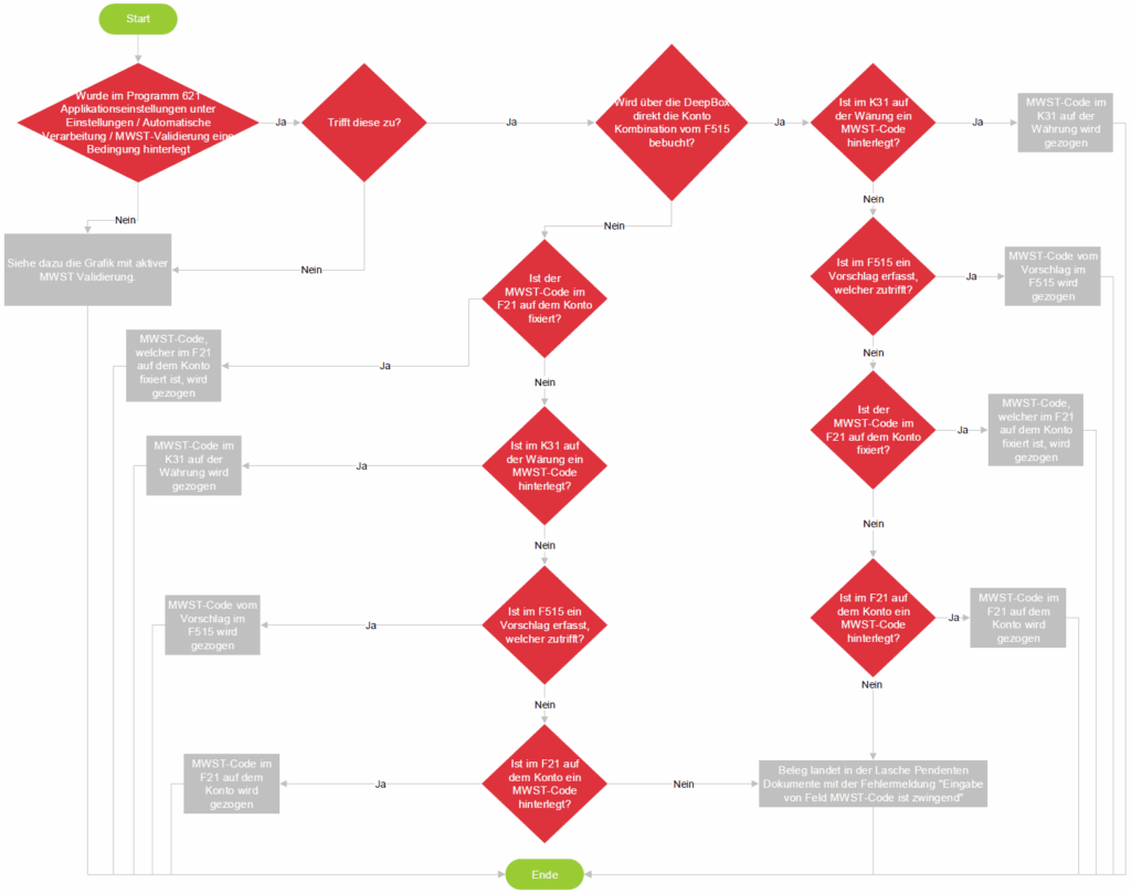Dieses Schema zeigt die standardmässige Logik zur Verbuchung der MWST-Code-Ermittlung in der Kreditorenbuchhaltung, unter der Voraussetzung einer aktiven MWST-Validierung im ERP-System.