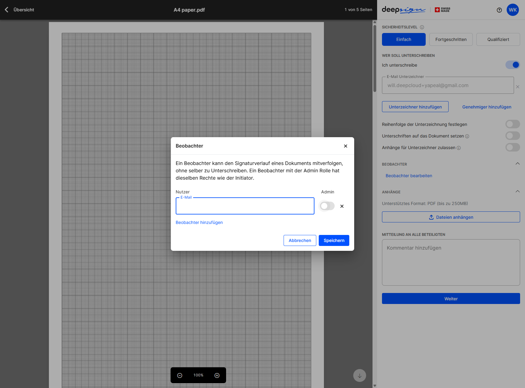 Die Beobachterrolle ermöglicht es, den Inhalt eines Dokuments sowie den aktuellen Fortschritt des Signaturprozesses einzusehen. Beobachter nehmen jedoch nicht aktiv am Signaturvorgang teil und müssen weder selbst unterzeichnen noch eine Genehmigung erteilen.