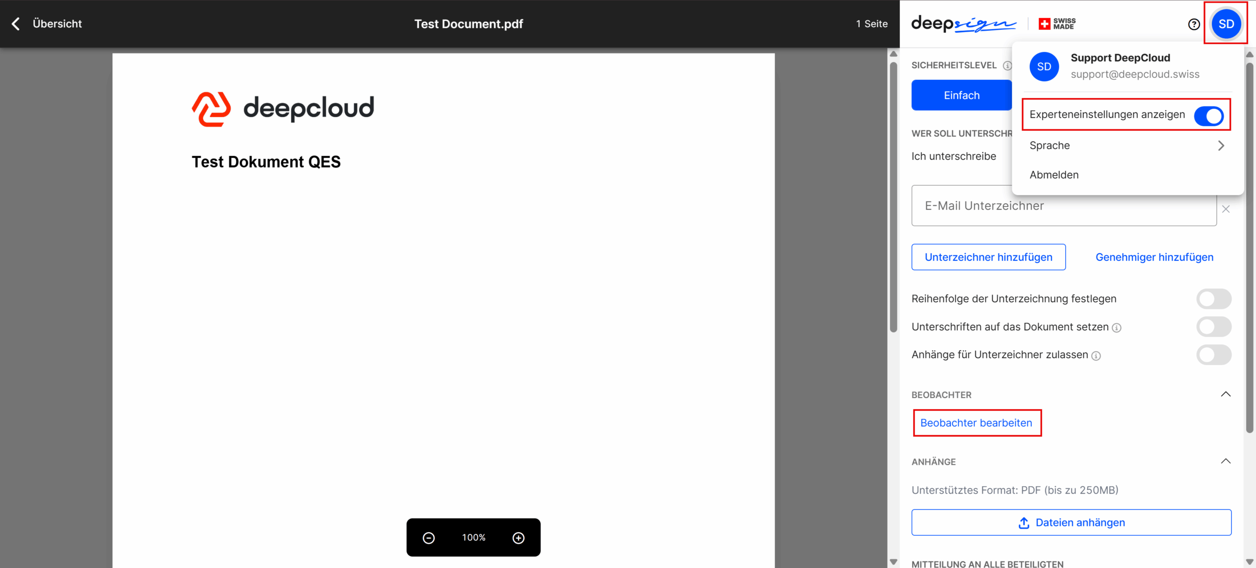 Die eingeladene Person kann vor dem Unterschreiben weitere Dokumente als Anhänge hochladen. Hierfür muss der Initiator die Experteneinstellungen anzeigen und anschliessend die ...