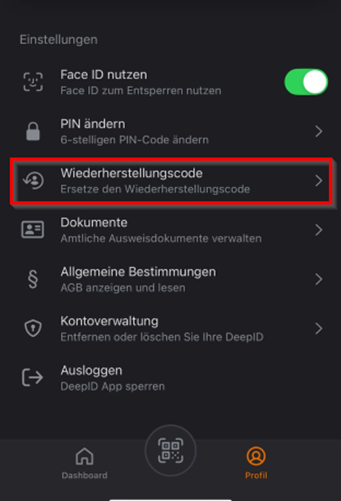 Besitzt man Zugriff auf die DeepID, kann ein neuer Code in der DeepID-App unter «Profil» generiert werden.