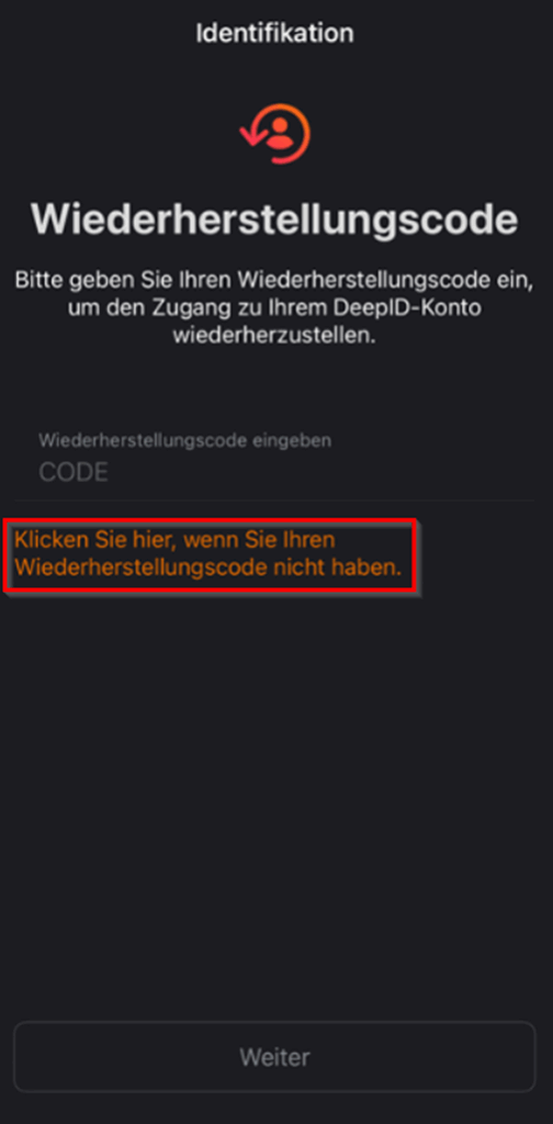 Sollte man diesen Code nicht mehr haben, kann die Eingabe des Codes innerhalb des Wiederherstellungsprozesses übersprungen werden, sodass man zum Prozess Re-Ident normal weitergeleitet wird.