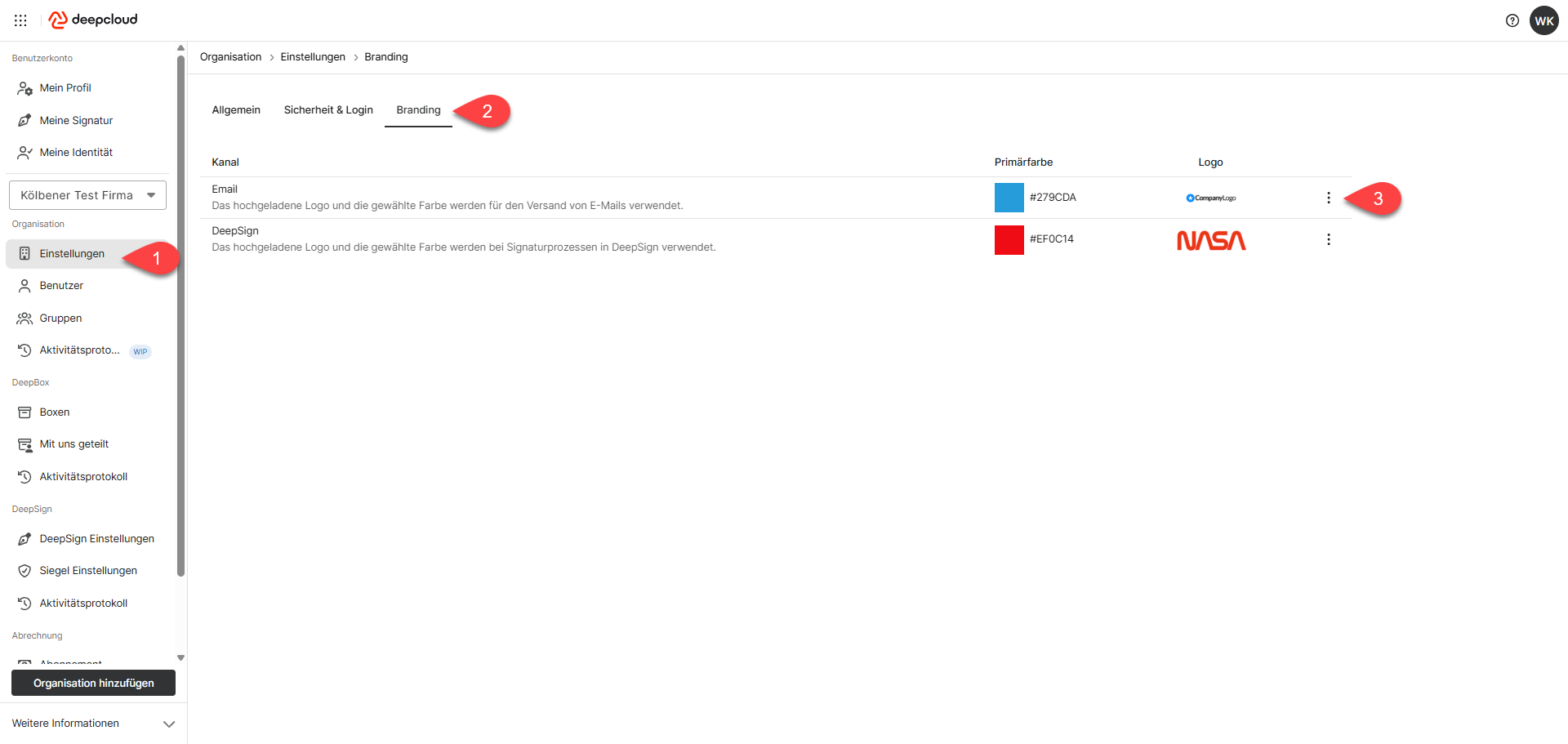 Ab dem „Medium“-Abonnement können Sie als Owner in Ihren Organisationsdaten das DeepSign-Branding aktivieren, um den Singaturprozess zu individualisieren. Dazu muss ...