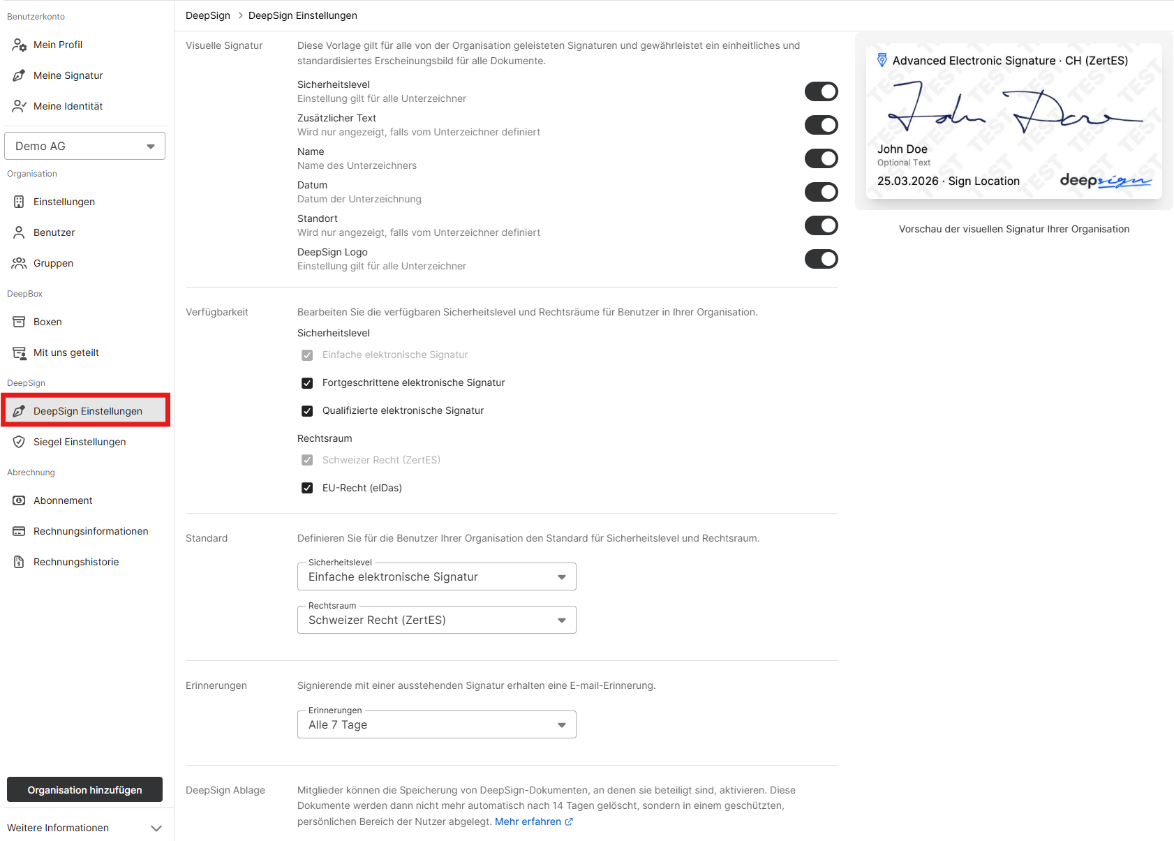 In den DeepSign-Einstellungen können Owner die Signatur nach ihren Bedürfnissen anpassen. Sie haben die Möglichkeit, verschiedene Elemente wie das Sicherheitslevel, zusätzliche Texte, Standort/Datum sowie das DeepSign-Logo zu integrieren. Wurden keine dieser Optionen ausgewählt, wird standardmässig alles angezeigt.