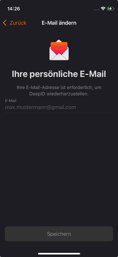 Auch die E-Mail-Adresse kann in der Profilverwaltung angepasst werden. Hierfür kann die neue E-Mail-Adresse eingegeben und im Anschluss verifiziert werden. Bei der Wahl der E-Mail-Adresse empfehlen wir, jeweils die private zu verwenden, da die DeepID mit der persönlichen Identität verknüpft ist.