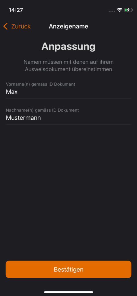 Der Anzeigename besteheht aus mindestens einem offiziellen Vor- sowie Nachname und lässt sich anpassen. Die offiziellen Namen müssen mit den hinterlegten Ausweisdokumenten übereinstimmen.