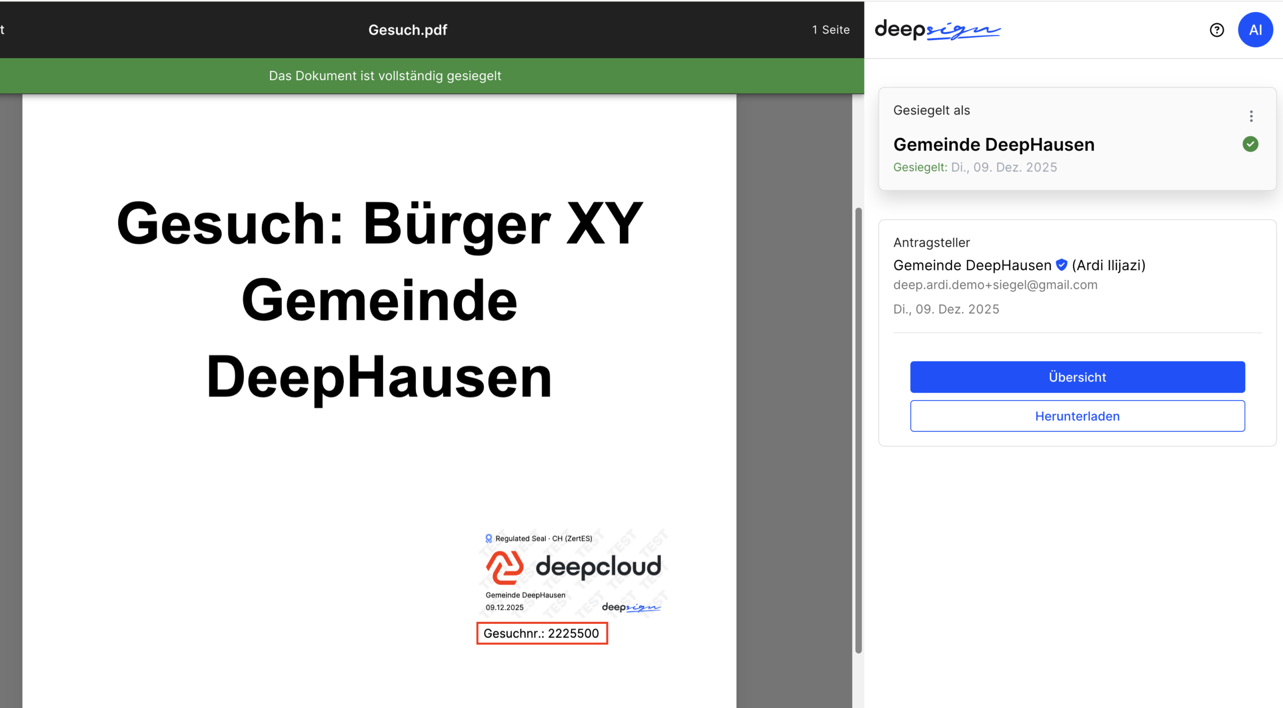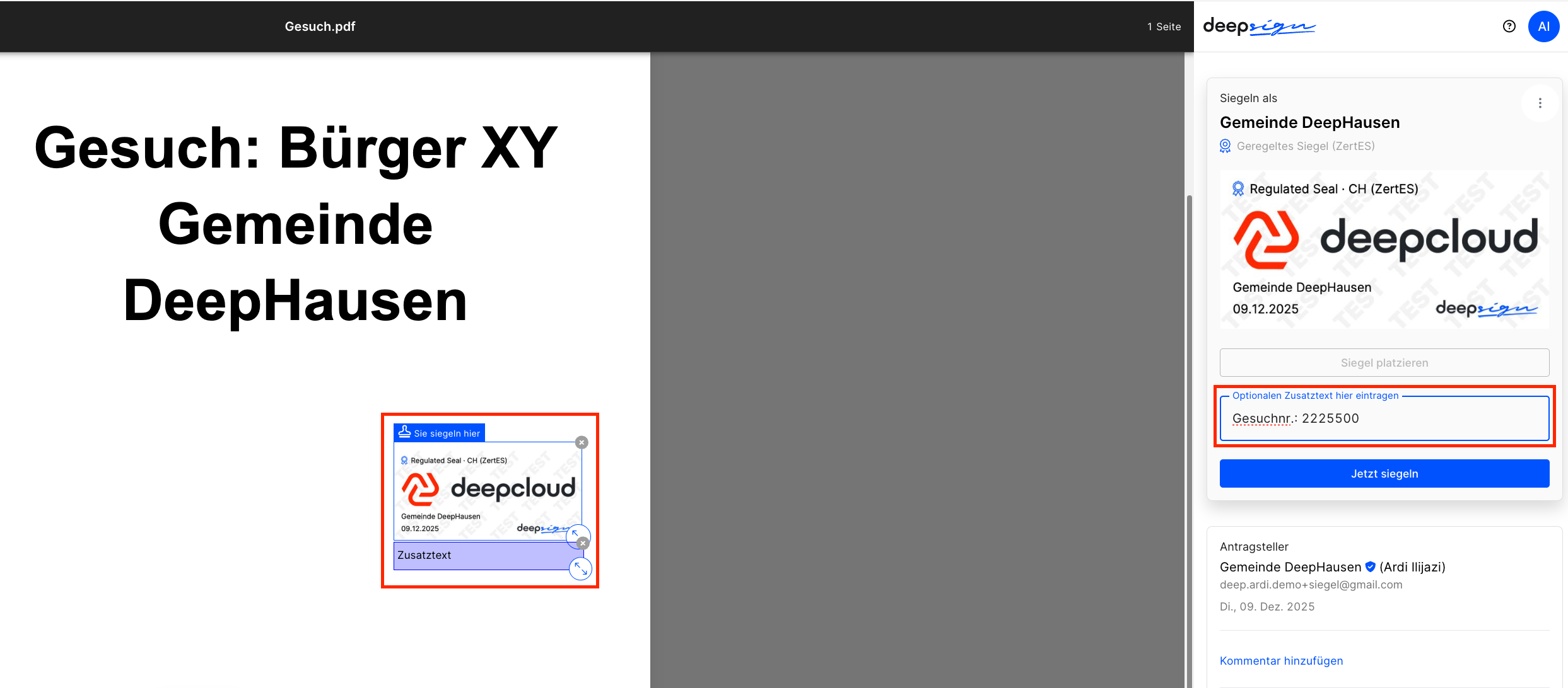 Unabhängig davon, ob eine Gemeinde eine Baubewilligung ausstellt oder ein Unternehmen ein offizielles Dokument prüft: DeepSign ermöglicht es, Referenznummern, rechtliche Hinweise oder interne Vermerke einfach und zuverlässig zu ergänzen.