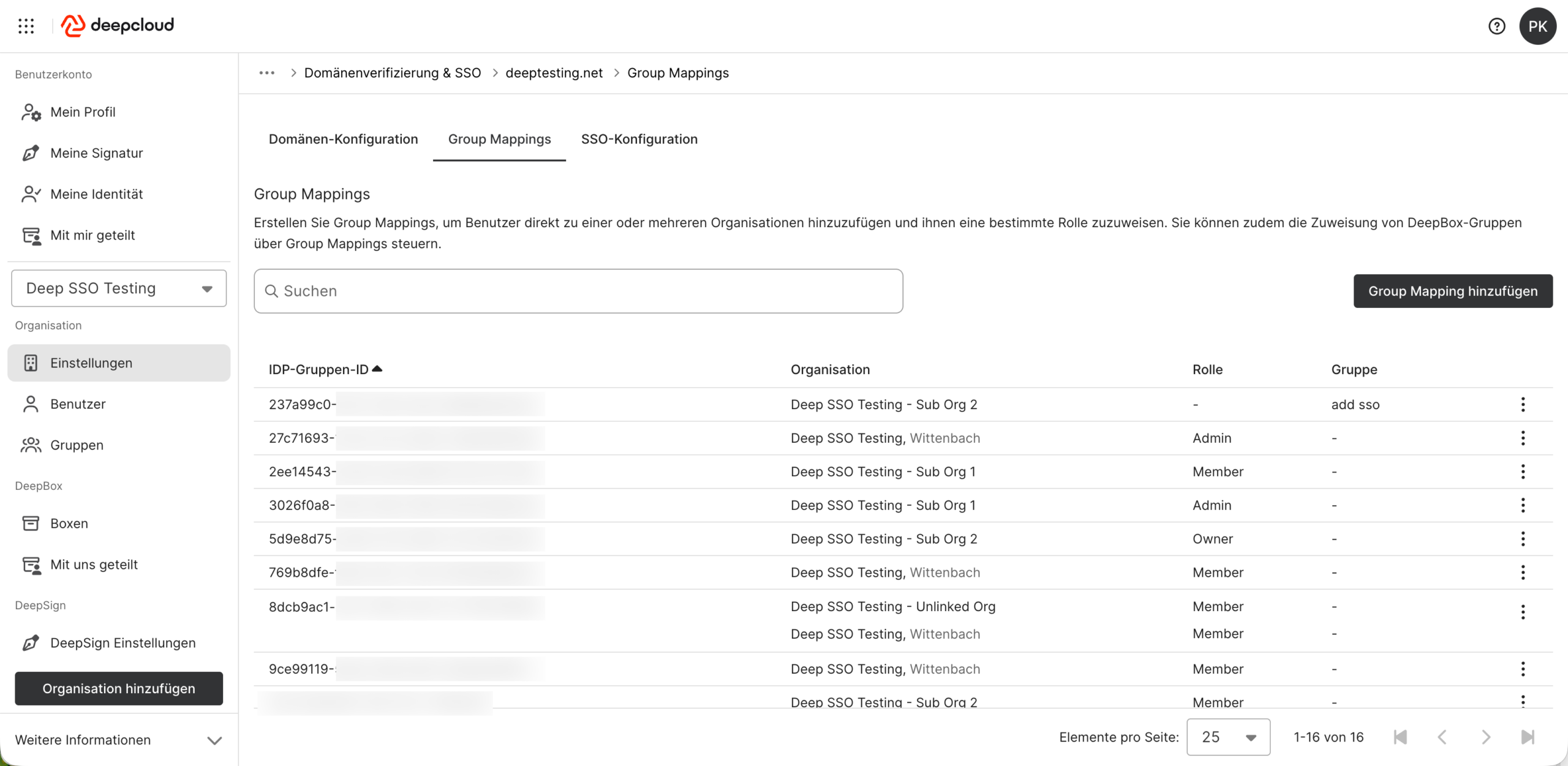 Mit Group Mappings können Owner und Admins Gruppen aus ihrem Identitätsanbieter (IdP) mit Organisationen, Rollen und Gruppen in DeepCloud verknüpfen. Dadurch lässt sich die Zuordnung von SSO-Benutzern zu DeepCloud-Organisationen, -Rollen und -Gruppen zentral im IdP verwalten, anstatt diese manuell in DeepCloud pflegen zu müssen. Das vereinfacht die Benutzerverwaltung und erhöht Konsistenz und Sicherheit.