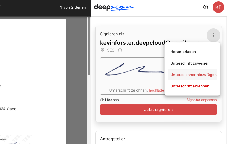 DeepSign: Unterschrift als Signierender einer anderen Person zuweisen