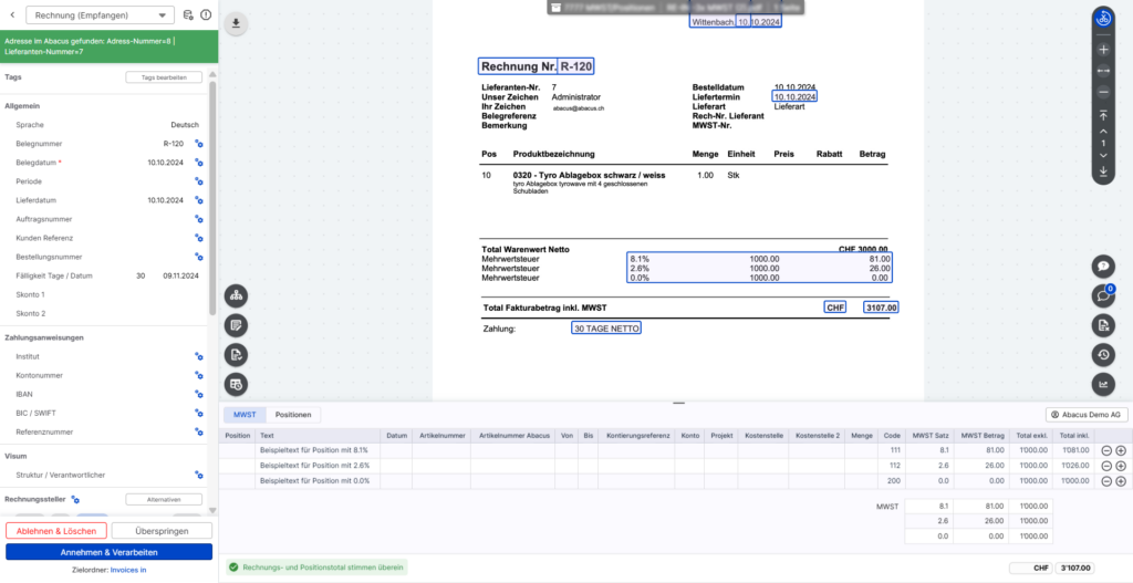 - Positionen-Tab: es werden alle Belegpositionen einzeln ausgelesen (sofern die “Positionserkennung” aktiviert ist)