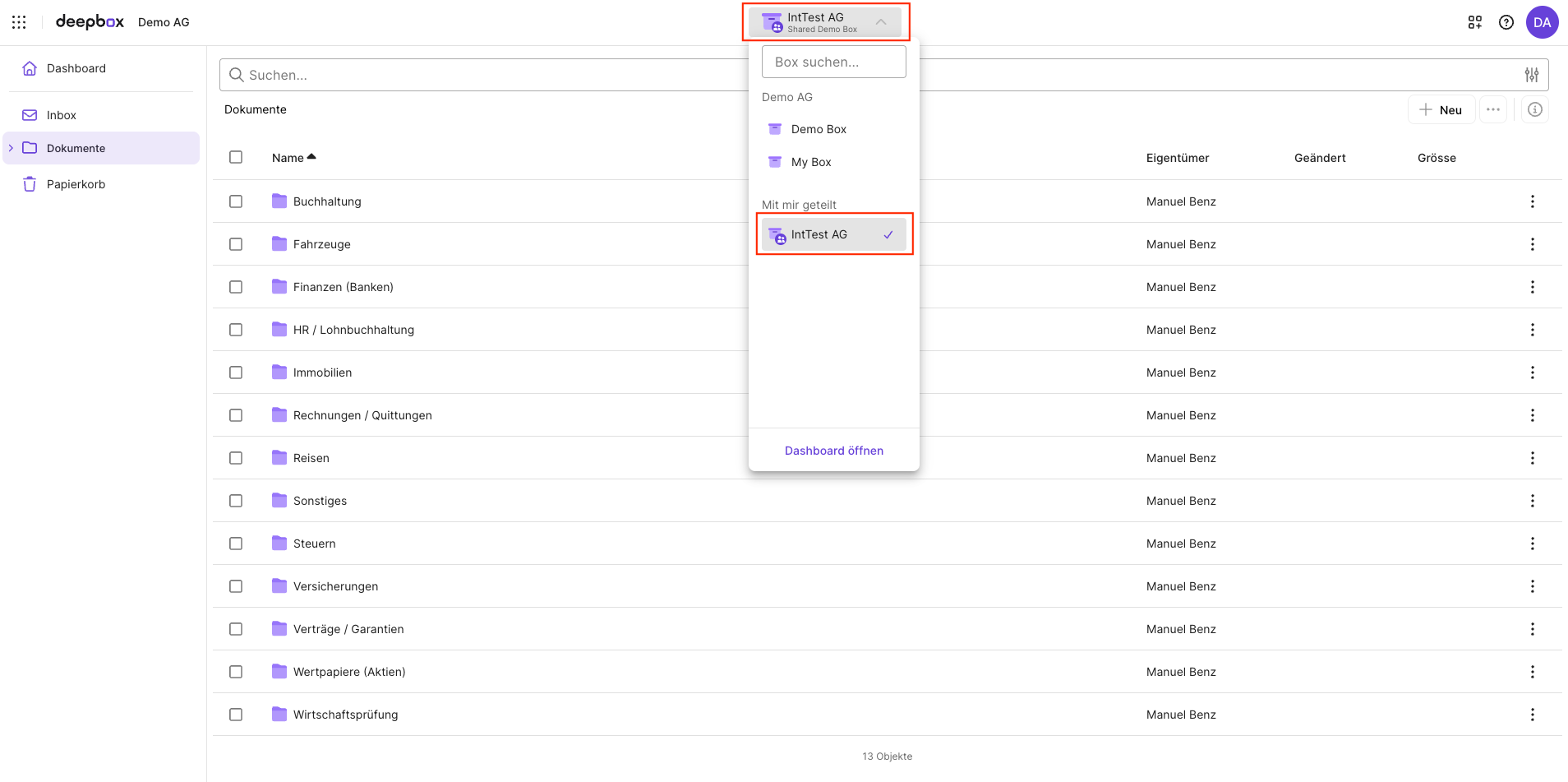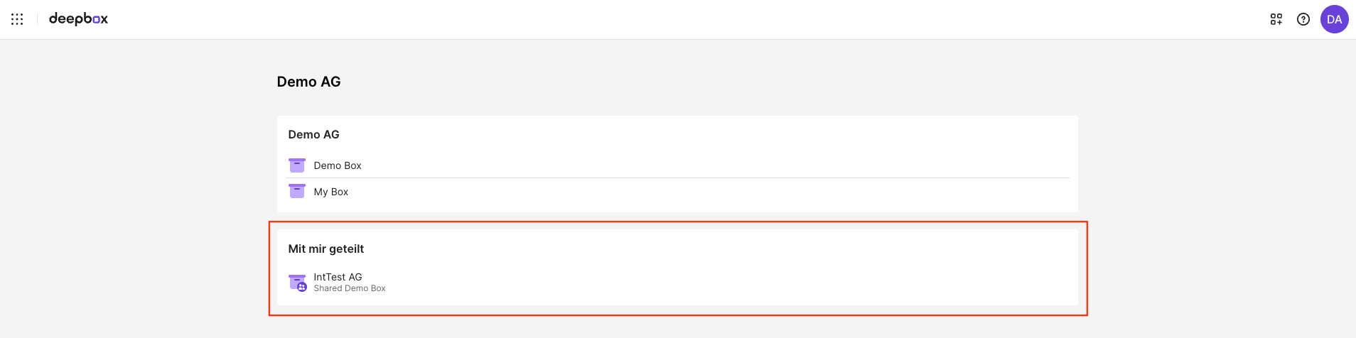 Der Bereich «Mit mir geteilt» zeigt alle Boxen an, die von externen Organisationen für Sie freigegeben wurden. Er erscheint automatisch, sobald eine Benutzerin oder ein Benutzer einer anderen Organisation eine Box mit Ihnen teilt, und bleibt sichtbar, solange Sie Zugriff auf mindestens eine externe Box haben. Erst wenn Ihr Zugriff auf sämtliche externen Boxen entzogen wurde, verschwindet dieser Bereich.