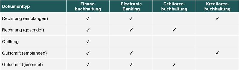 Hinweis: In welcher Applikation ein Beleg letztlich erscheint oder verbucht wird, hängt massgeblich von der Lizenzierung der jeweiligen Applikationen ab. Detaillierte Informationen hierzu, werden in den unten verlinkten Support-Artikeln beschrieben.