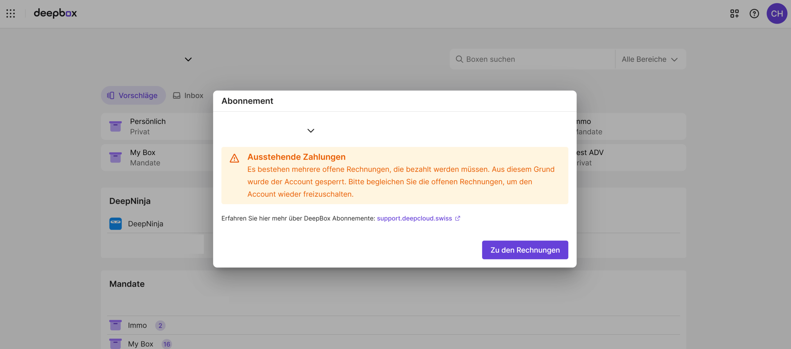 - DeepBox: Blockierung erfolgt zum Beispiel beim Upgrade des Abonnements oder beim Hinzufügen einer kostenpflichten Box (z.B. Advanced Box)