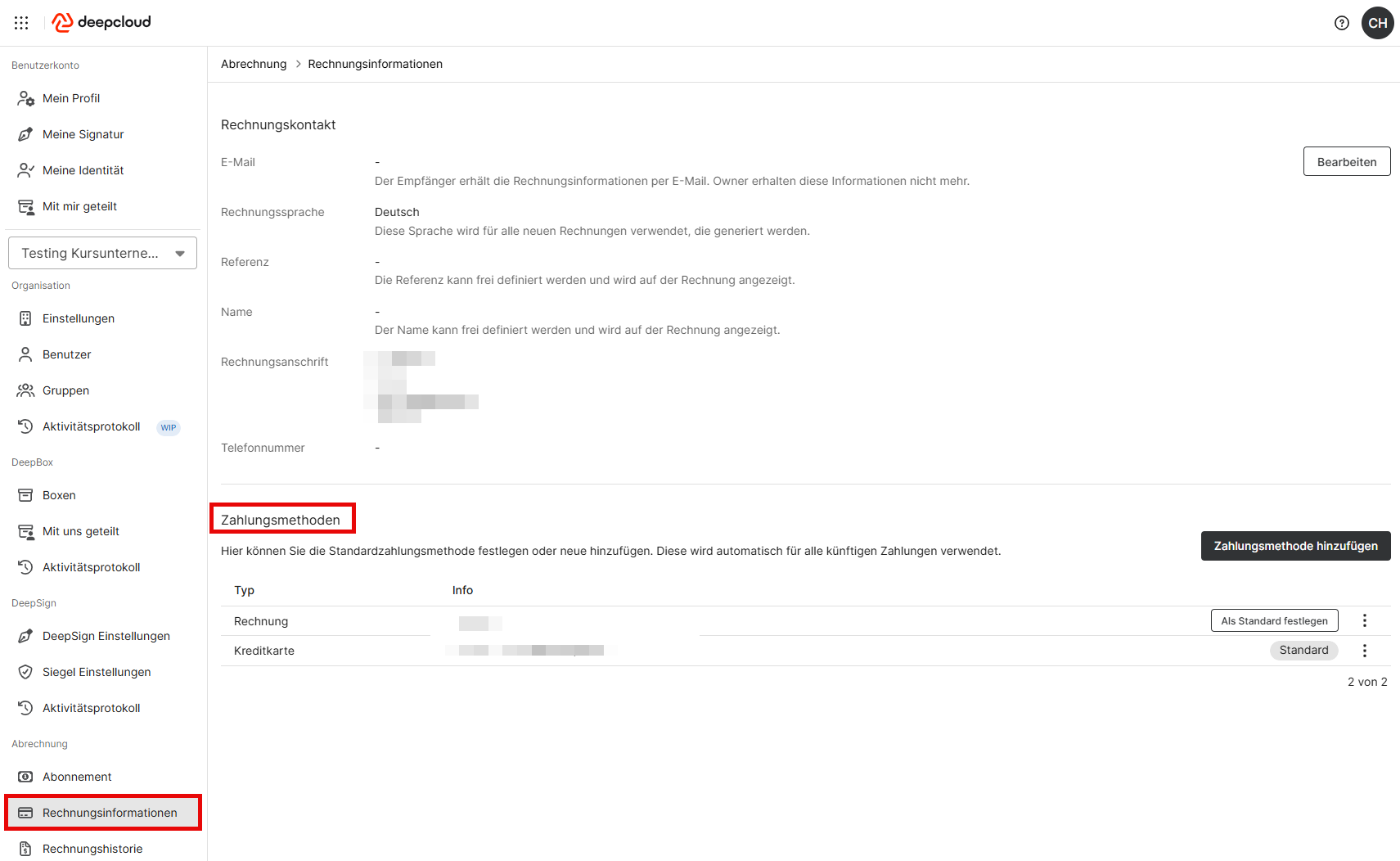 Die Zahlungsmethode lässt sich in der Kontoverwaltung unter «Rechnungsinformationen» durch den Owner der Organisation anpassen und verwalten.