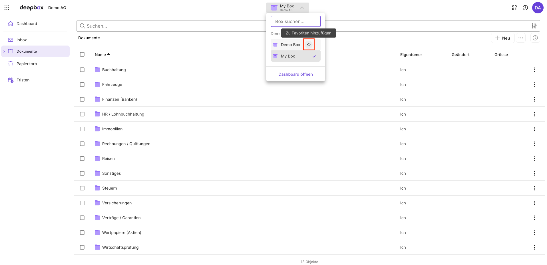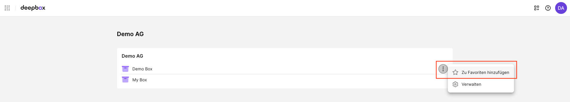 Die favorisierten Boxen werden Ihnen sowohl auf dem Dashboard als auch im Navigationselement im Header angezeigt, sofern Sie sich innerhalb einer Box befinden.