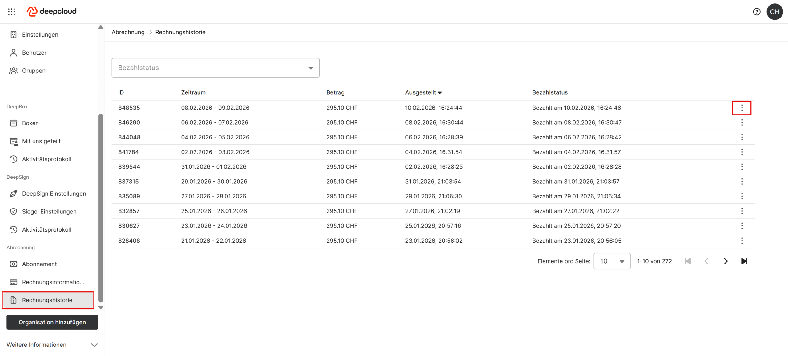 In der Kontoverwaltung sind die Rechnungen unter «Rechnungshistorie» verfügbar. Über die drei vertikalen Punkte lässt sich die Rechnung anzeigen und als PDF herunterladen.