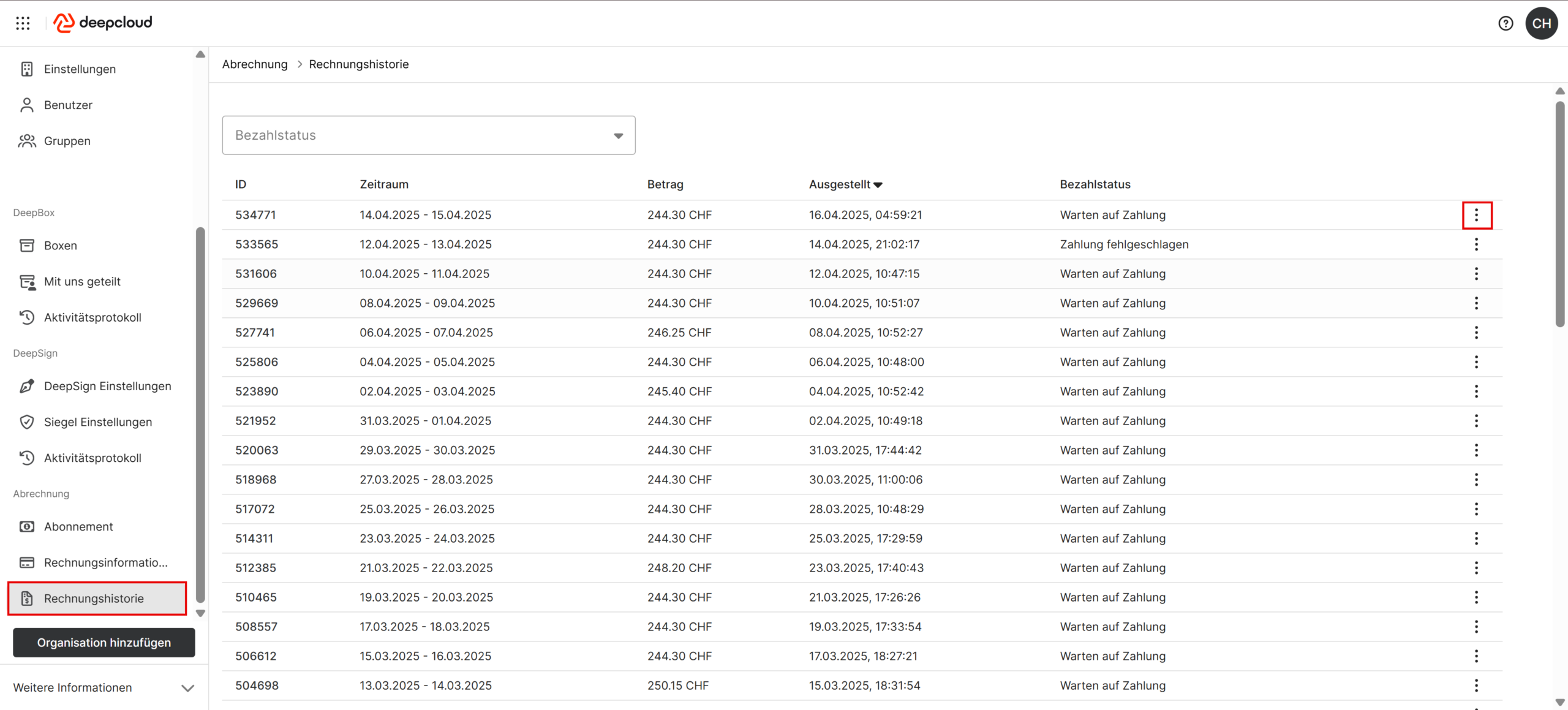 Als Owner einer Organisation können Sie eine ausstehende Zahlung manuell begleichen. Klicken Sie dazu auf den Banner auf dem DeepBox Dashboard oder gehen Sie dazu zur Kontoverwaltung unter „Rechnungshistorie“.