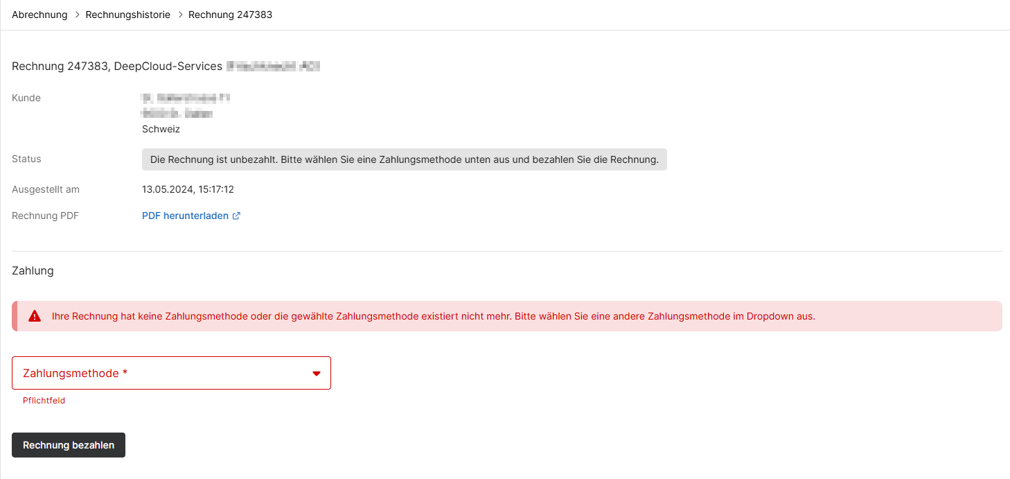 Wählen Sie die offene Rechnung aus. Ändern Sie bei Bedarf die Zahlungsmethode und klicken Sie anschliessend auf „Rechnung bezahlen“.