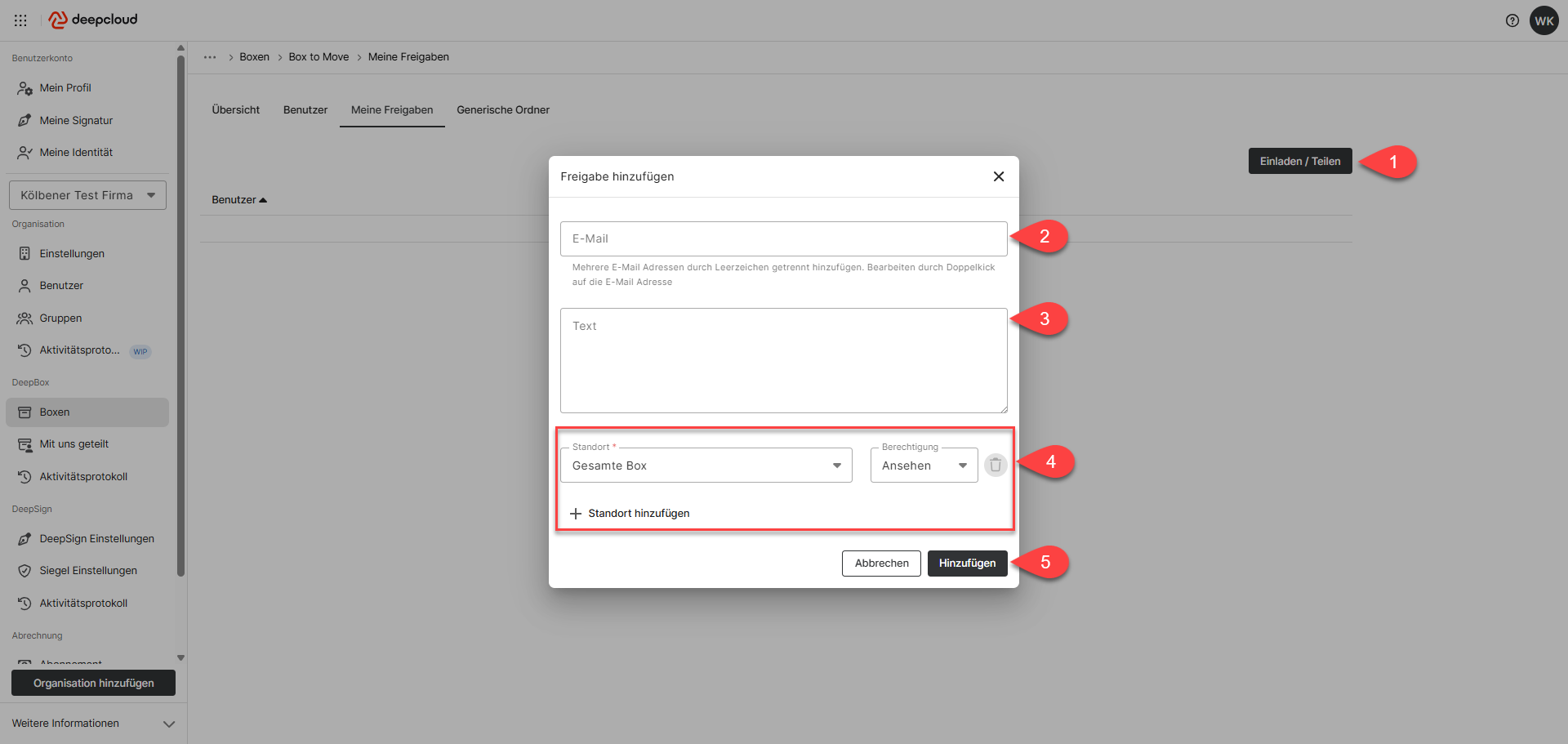 Owner, Admins oder Member mit Organisationsrechten auf einer Box können externe Personen im DeepAdmin unter Boxen einladen.