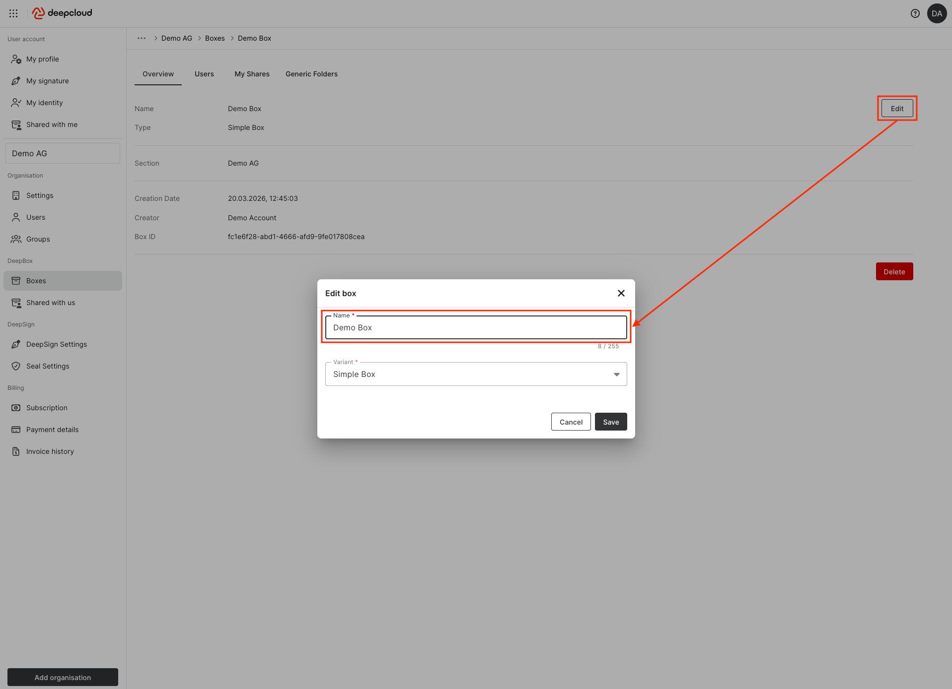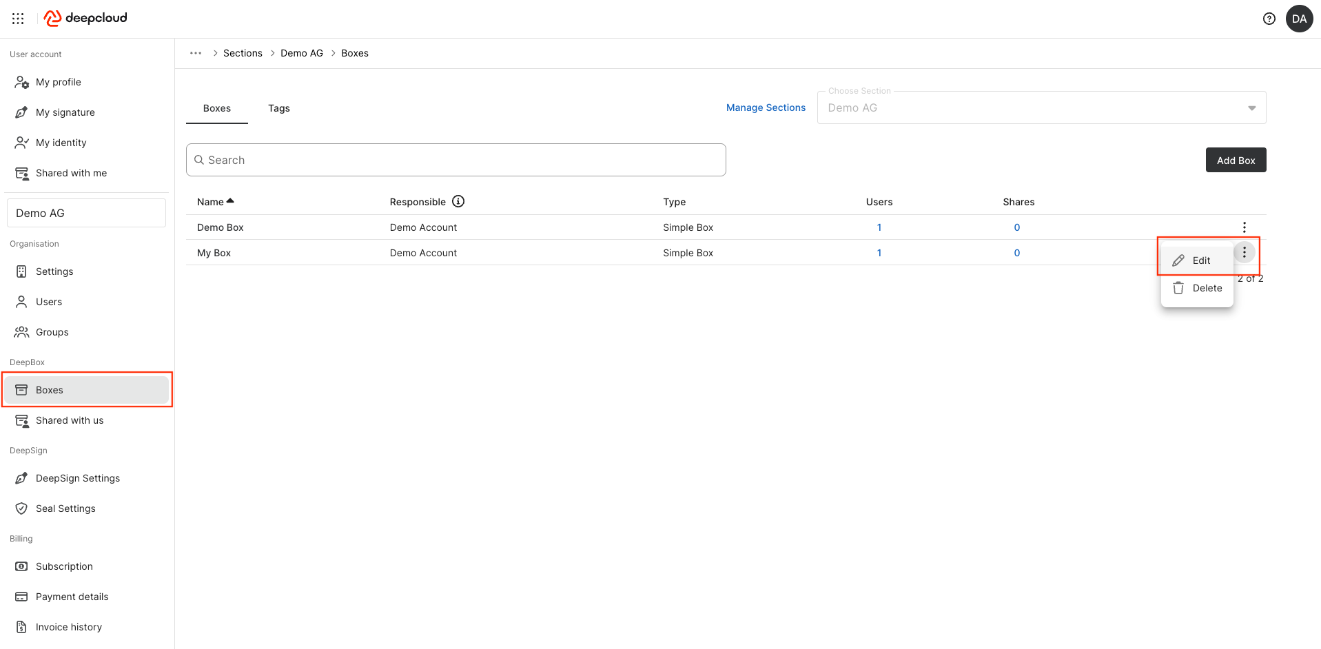 - In the navigation menu, go to DeepBox and select “Boxes”. Click on the three dots next to the box whose name you want to change, then select the “Edit” function.