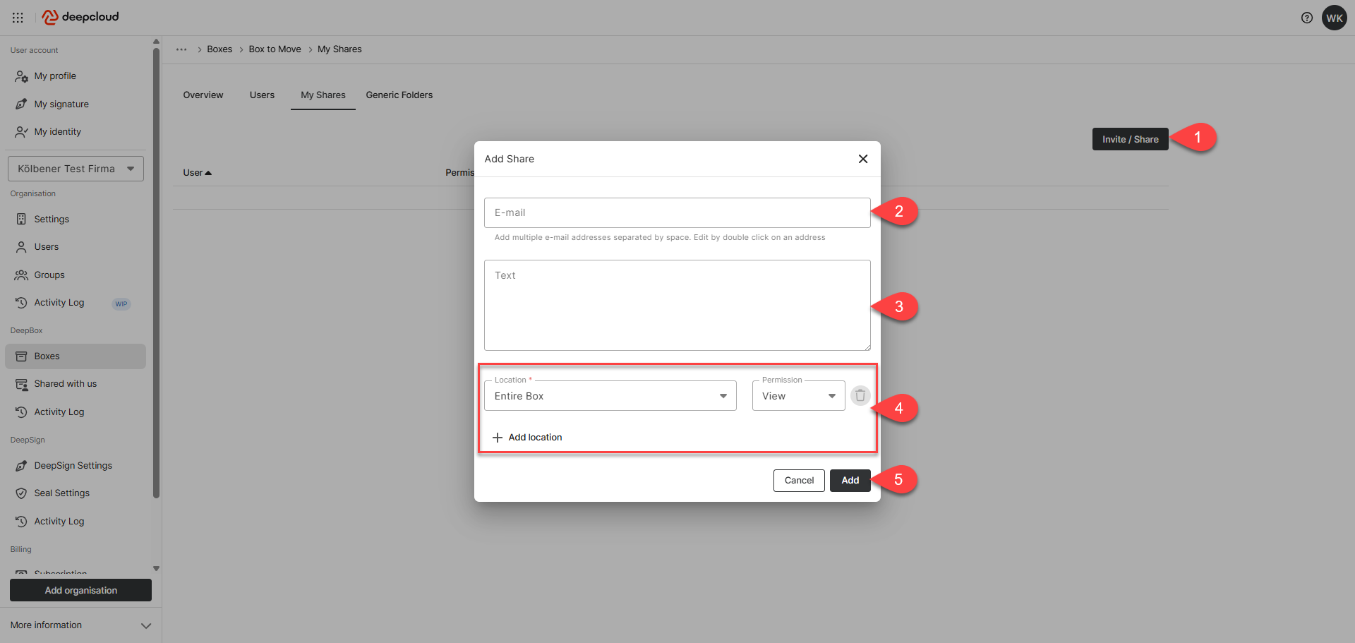 Owners, Admins, or Members with organisational rights on a Box can invite external users in DeepAdmin under “Boxes.”
