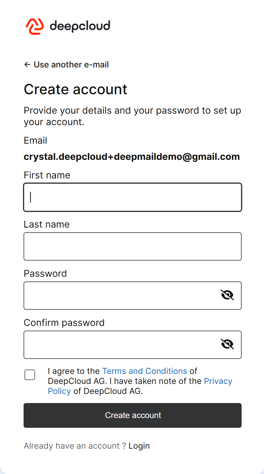 To create an account, simply define your first name, last name, and a secure password, and accept the terms and conditions.