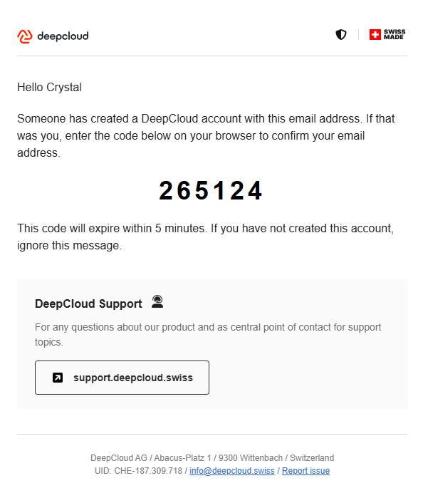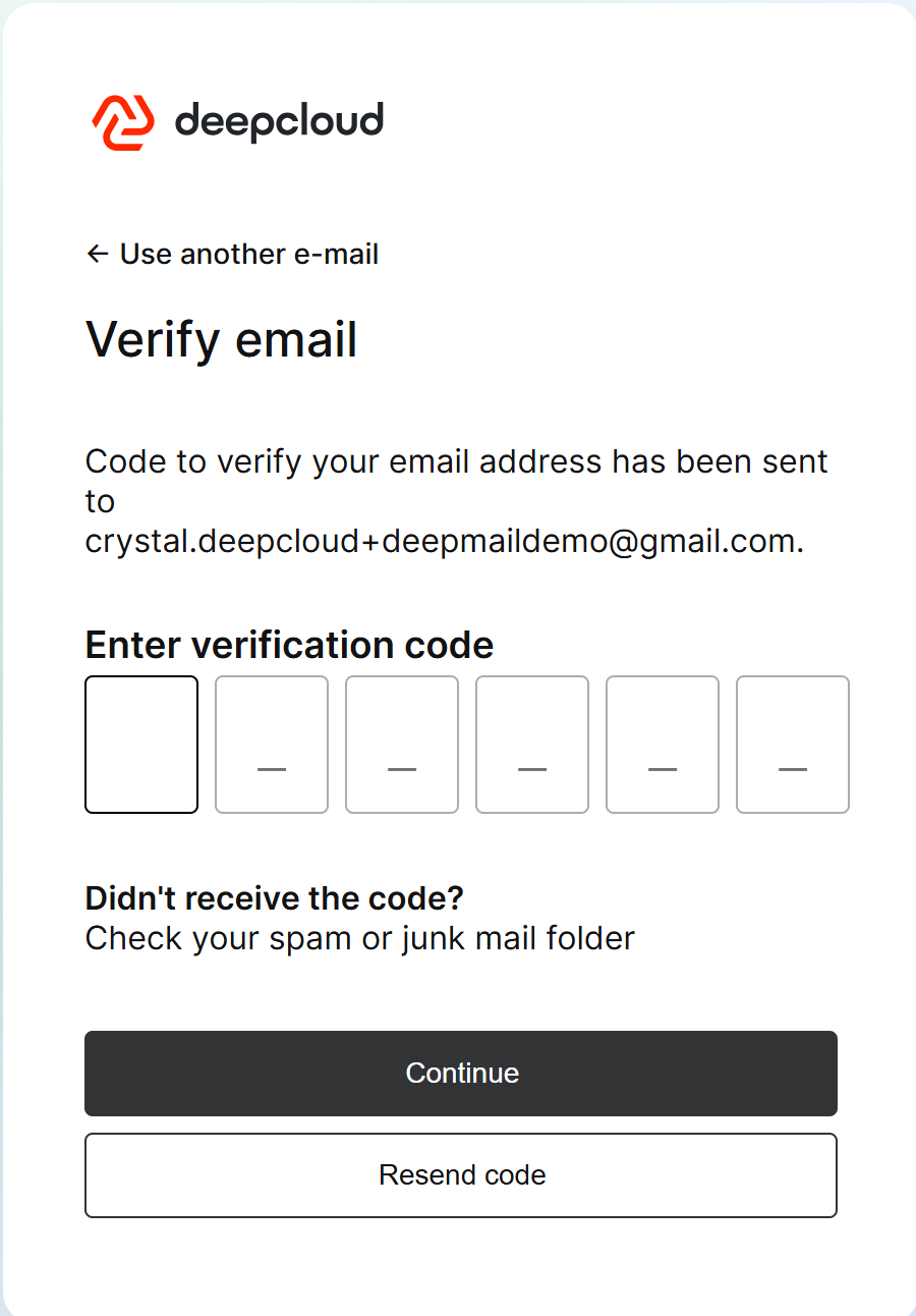 Afterwards, a 6-digit code will be sent to the specified email address. Enter this code to verify your email address.