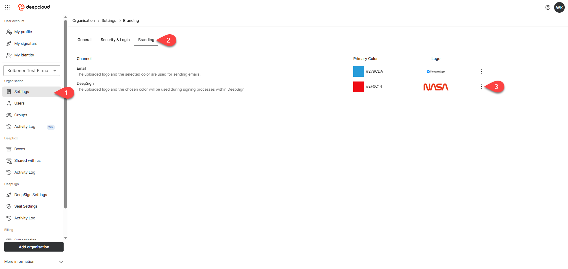 From the “Medium” subscription onwards, you as the Owner can activate DeepSign Branding in your organisation data to individualise the DeepSign process. To do this, the organization must also be verified.