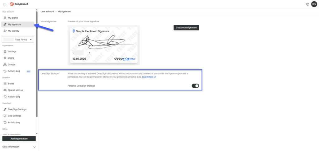 By default, DeepSign Storage is deactivated for every user and must be actively activated.