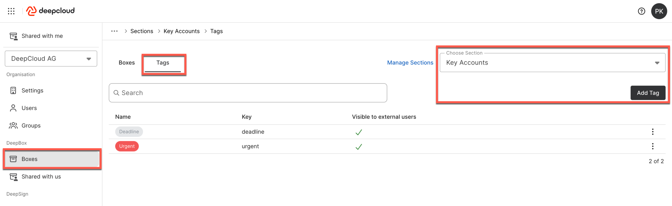 In the organisation settings, owners and admins can manage tags centrally. It is important to always select the correct section, because tags are defined and used per section.