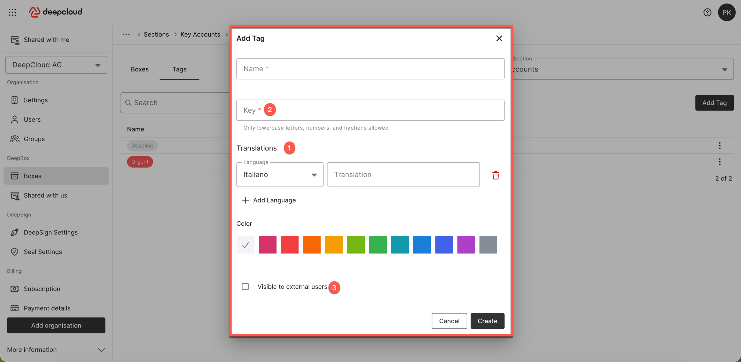 The “Visible to external users” checkbox (3) controls whether a tag is visible to external users who have access to a box or its documents via a share. If the option is disabled, the tag is only visible to internal users of the organisation.