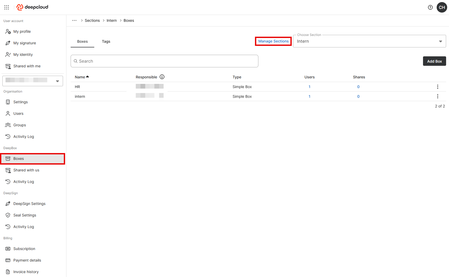The DeepBox can be individually structured using sections. These sections can be managed in the account management under the “Boxes” tab. The sections can be accessed at the top right using the “Manage sections” button.