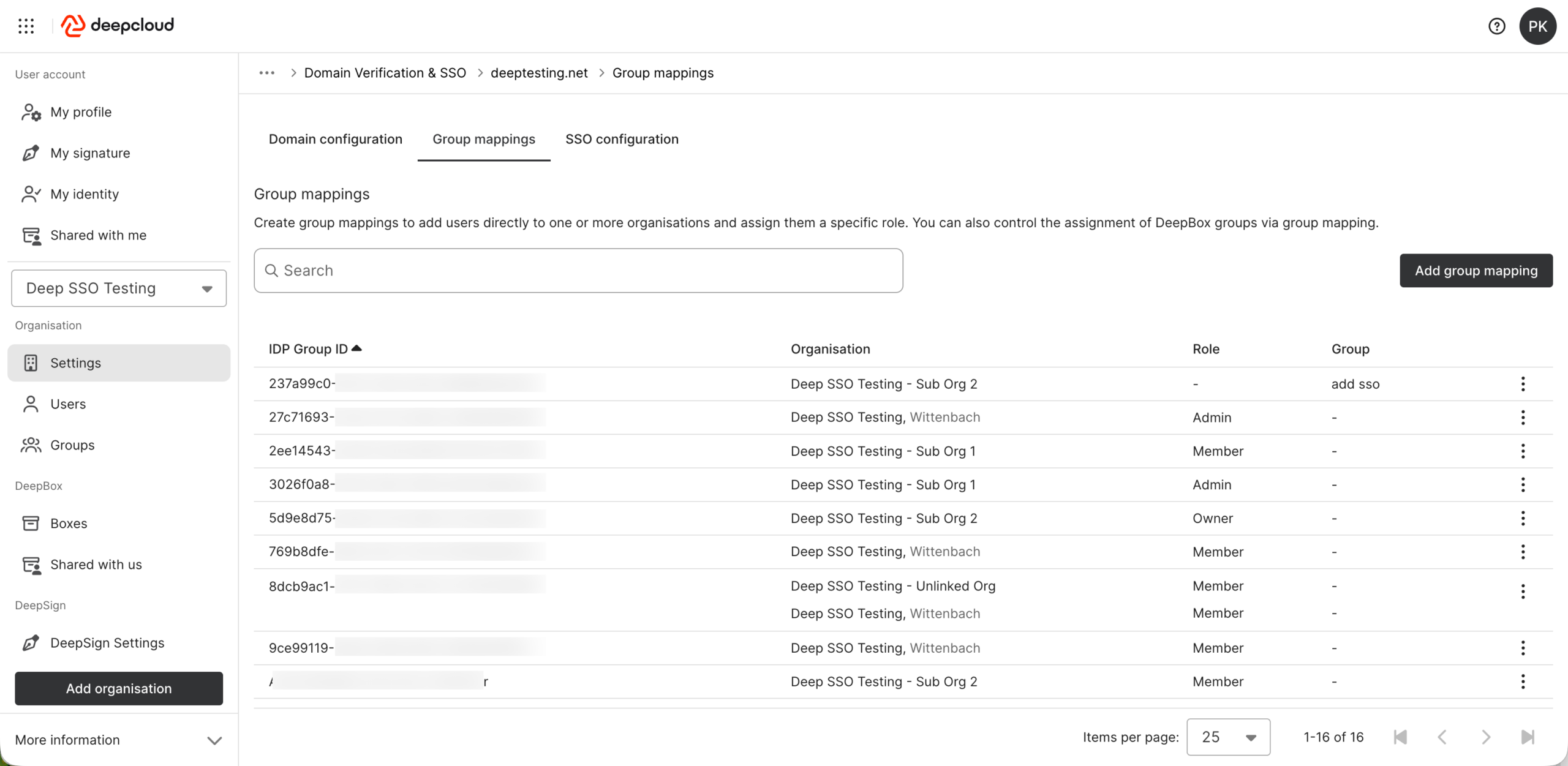 With Group Mappings, owners and admins can link groups from their identity provider (IdP) to organizations, roles, and groups in DeepCloud. This allows the assignment of SSO users to DeepCloud organizations, roles, and groups to be managed centrally in the IdP instead of manually in DeepCloud. This simplifies user management and increases consistency and security.