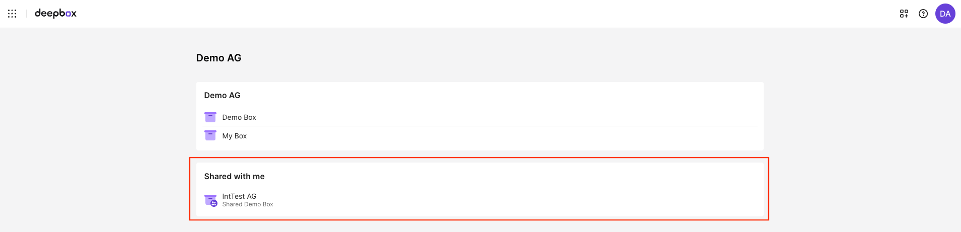The “Shared with me” section shows all boxes that have been shared with you by external organizations. It appears automatically as soon as a user from another organization shares a box with you and remains visible as long as you have access to at least one external box. This section only disappears once your access to all external boxes has been revoked.