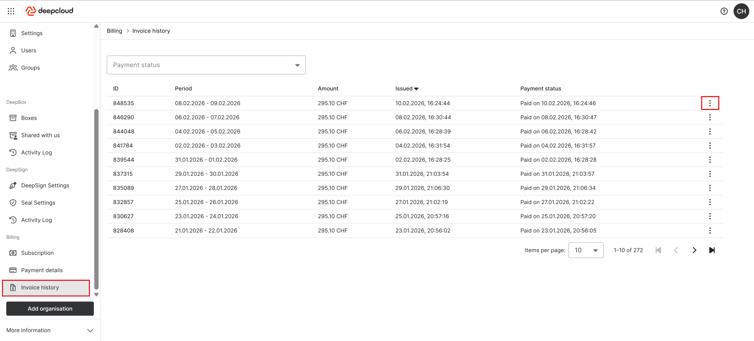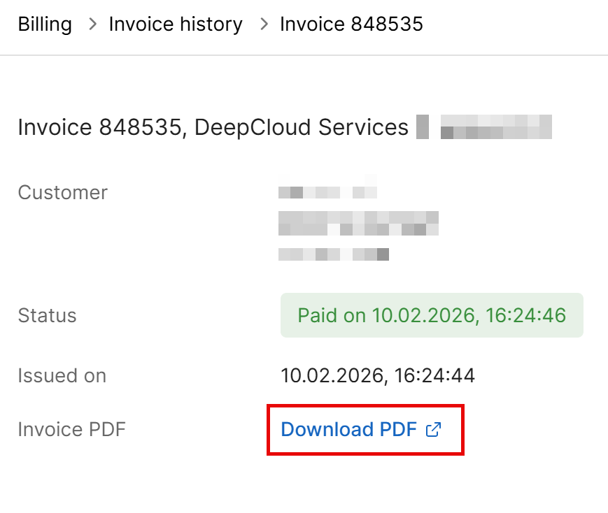 In the account management, invoices are available under “Invoice history”. By clicking on the three vertical dots, the invoice can be displayed and downloaded as a PDF.