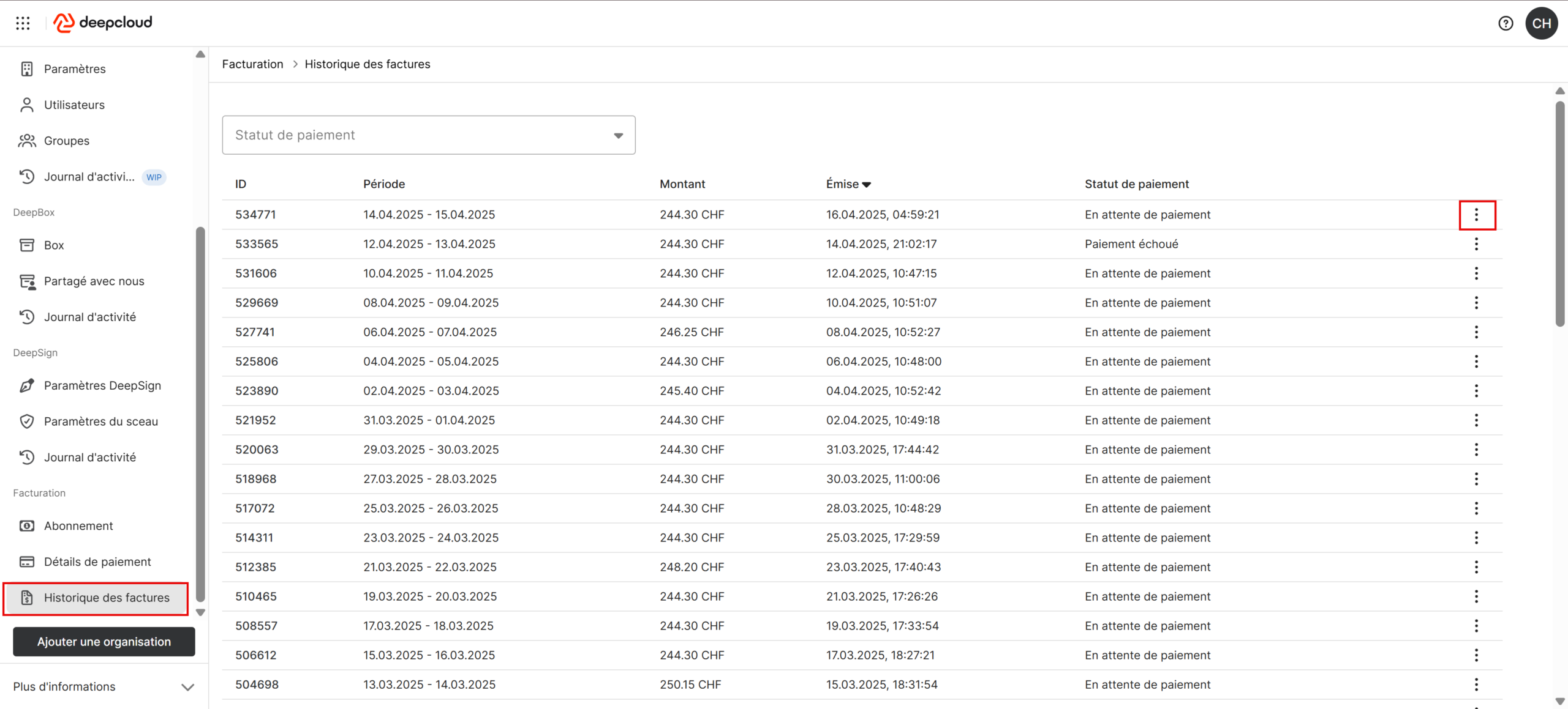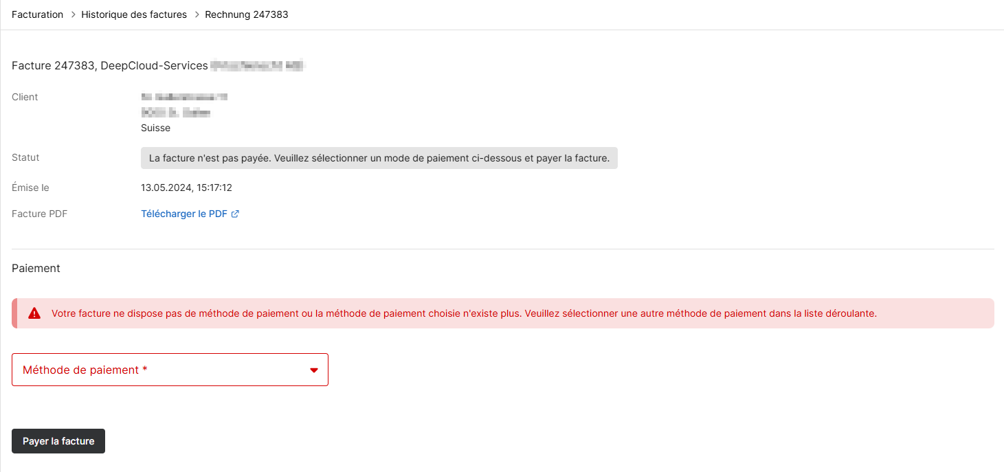 En tant que propriétaire d’une organisation, vous pouvez déclencher manuellement un paiement en attente. Pour ce faire, allez dans la gestion de compte sous « Historique des factures ».