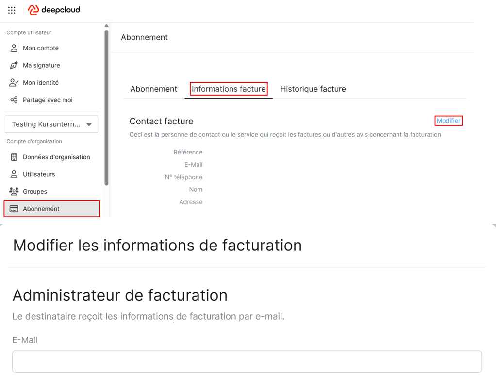 - Naviguez vers « Abonnement » ➔ « Informations facture ».