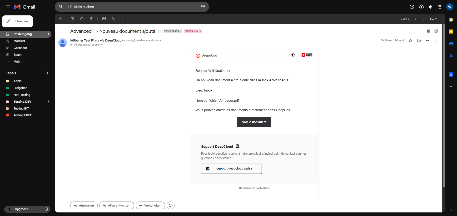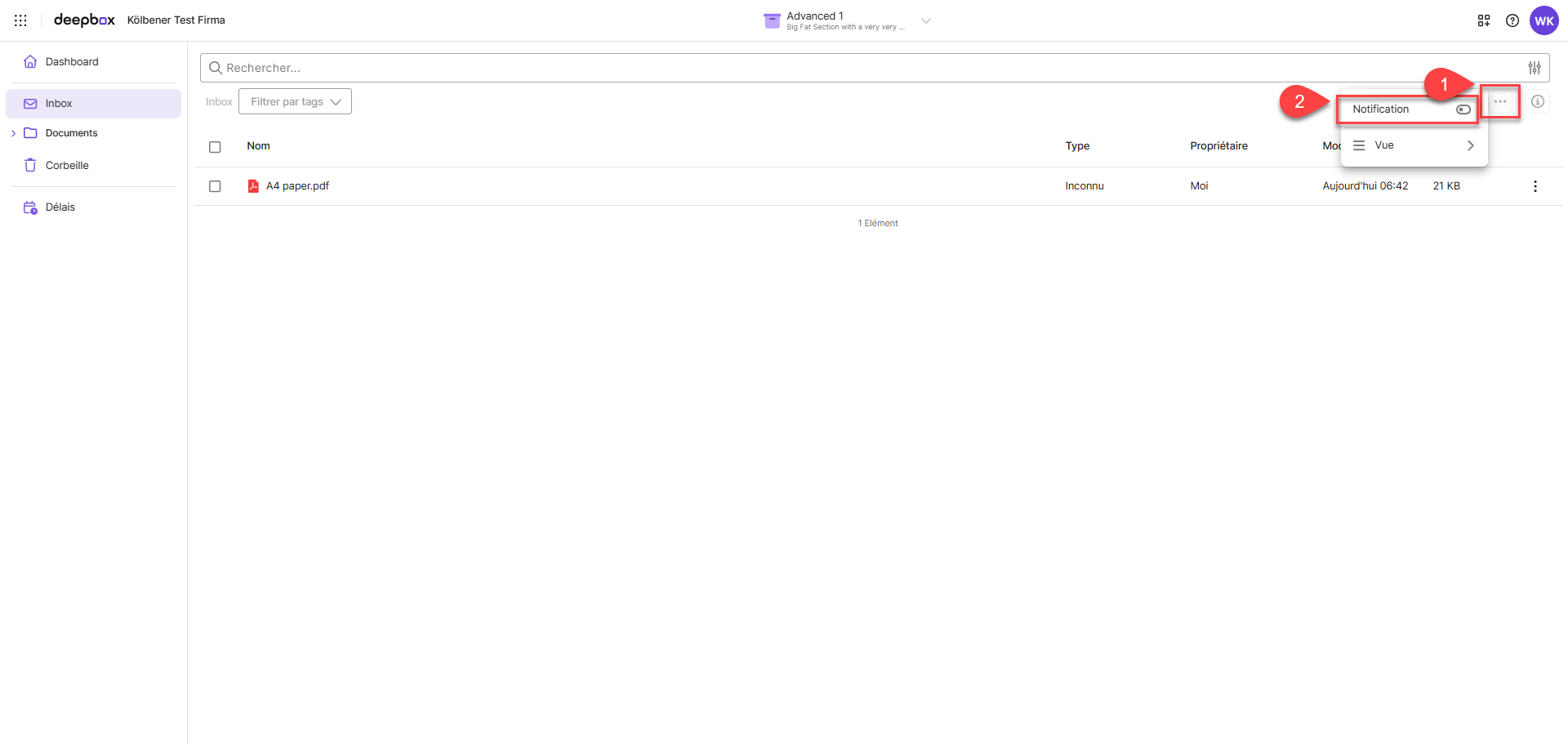 Lorsque plusieurs utilisateurs travaillent avec les mêmes boîtes, il peut arriver que les personnes ne soient pas informées de tous les téléchargements effectués dans les boîtes. Pour éviter ce cas de figure, il est possible d’activer la fonction Notification pour chaque box (Simple Box ainsi que Advanced Box) au sein de la boîte de réception ou du dépôt de documents à chaque niveau de dossier.