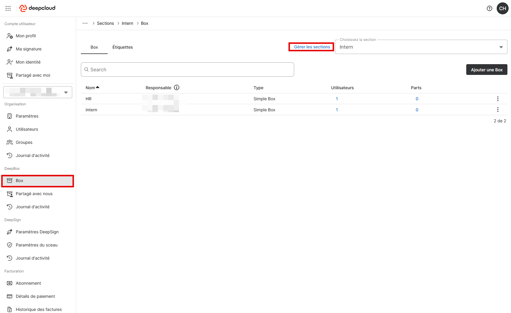 La DeepBox peut être structurée individuellement à l’aide de sections. Ces zones peuvent être gérées dans l’onglet « Box » de la gestion de compte. En haut à droite, vous pouvez accéder aux sections en utilisant le bouton « Gérer les sections ».
