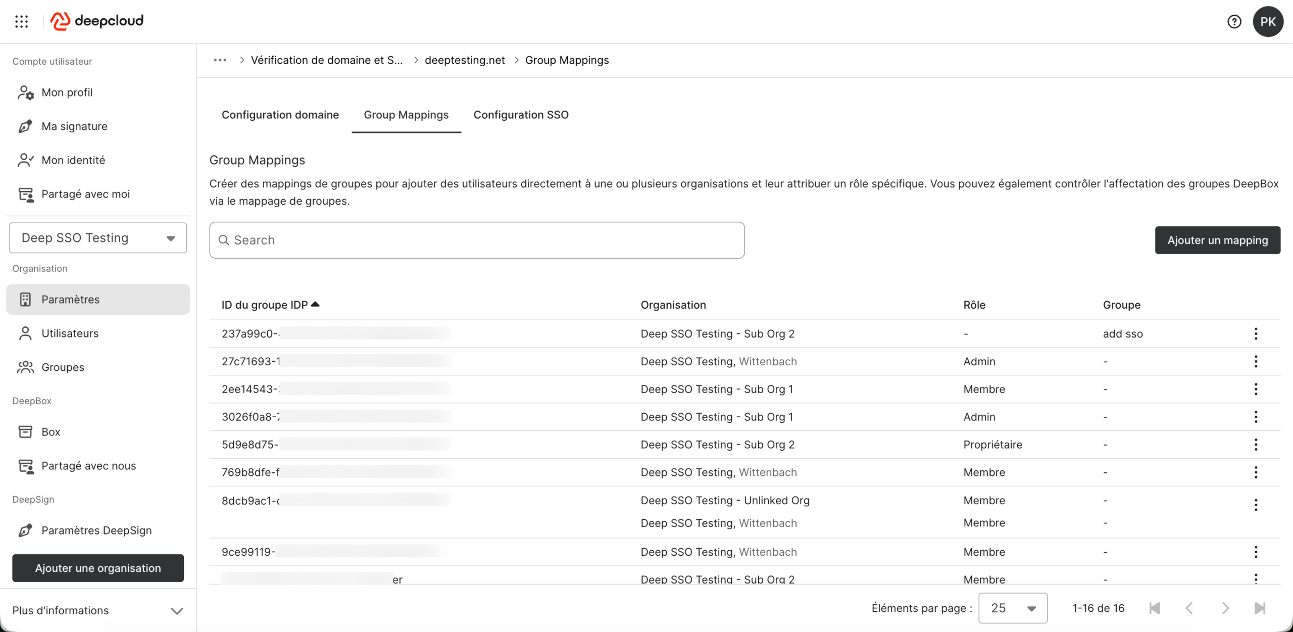 Les mappages de groupes permettent aux propriétaires et aux administrateurs d’associer des groupes de leur fournisseur d’identité (IdP) à des organisations et des rôles dans DeepCloud. De cette façon, l’association des utilisateurs SSO aux organisations DeepCloud peut être gérée de manière centralisée dans l’IdP, au lieu de devoir le faire manuellement dans DeepCloud. Cela simplifie la gestion des utilisateurs et améliore la cohérence et la sécurité.