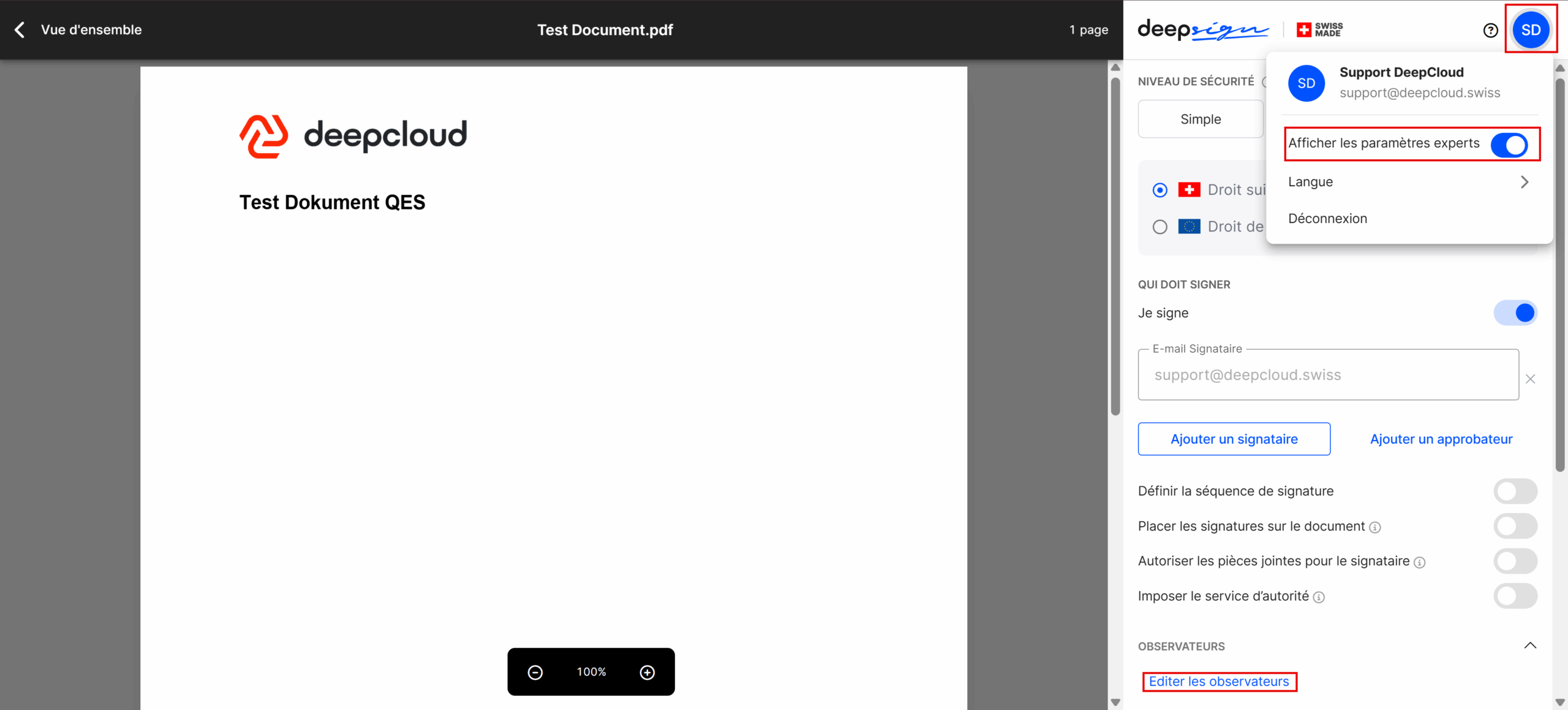 La personne invitée peut télécharger d’autres documents en pièces jointes avant de signer. Pour cela, l’initiateur doit afficher les paramètres de l’expert ...