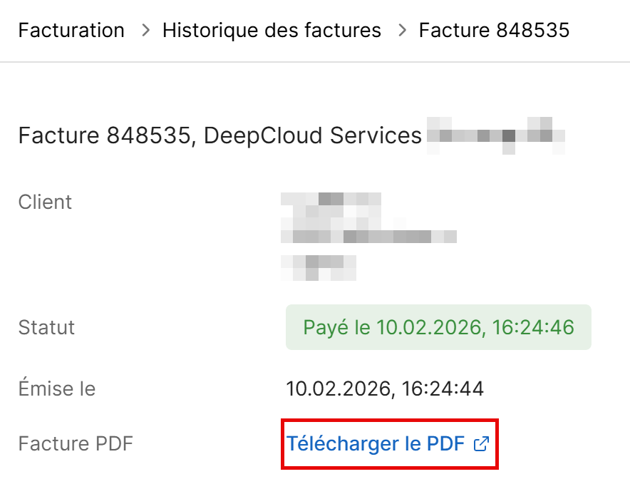 Dans la gestion de compte, les factures sont disponibles dans « Historique des factures ». En cliquant sur les trois points verticaux, vous pouvez afficher la facture et la télécharger au format PDF.