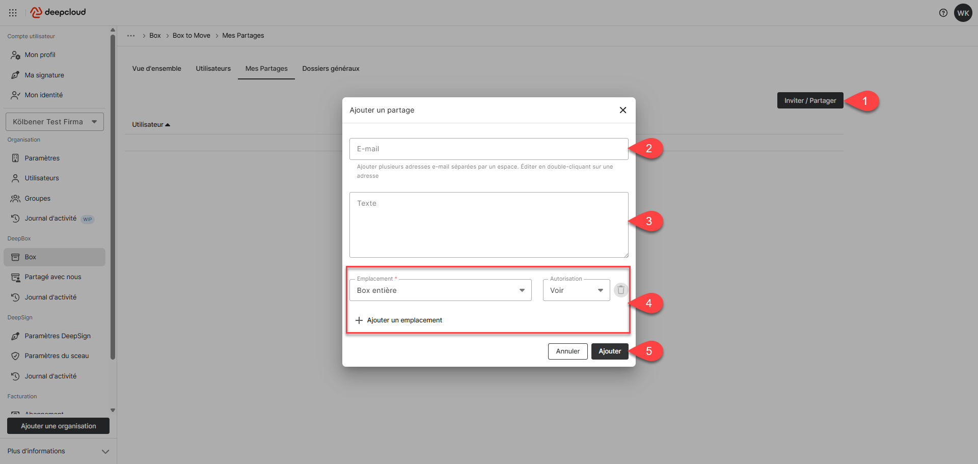 Owner, Admin ou Member disposant de droits d’organisation sur une Box peuvent inviter des personnes externes dans DeepAdmin sous « Box ».