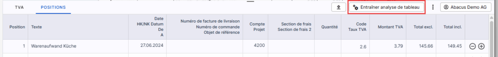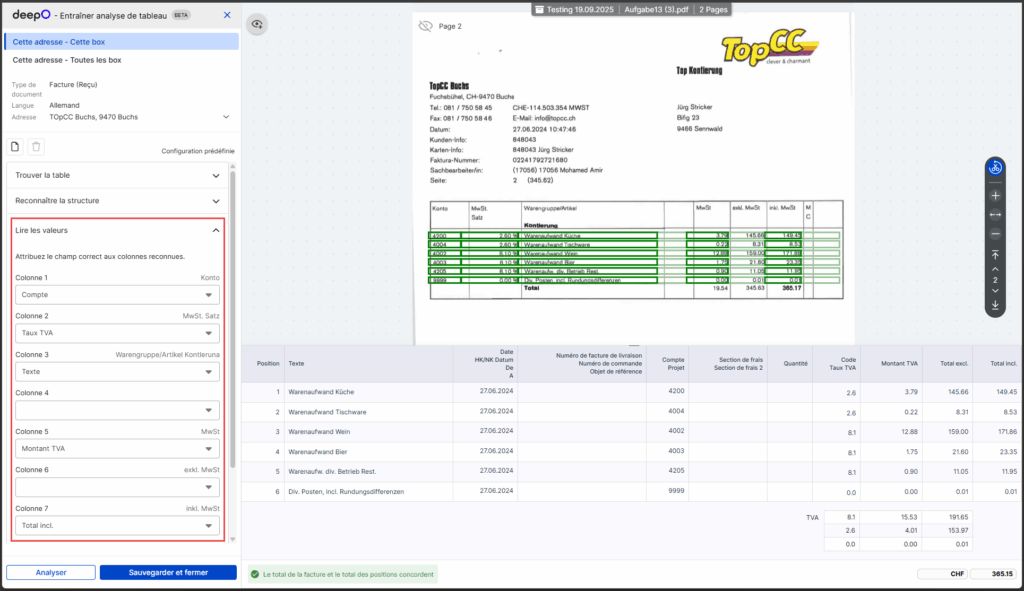 Dès que le tableau est correctement reconnu, vous pouvez terminer l’entraînement en cliquant sur « Enregistrer & Fermer ». A l’avenir, toutes les factures de ce fournisseur avec une mise en page identique seront automatiquement reconnues.