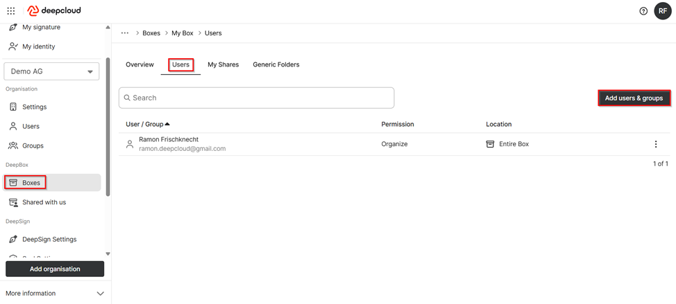 Vai alla scheda “Utenti” nelle impostazioni del box e clicca sul pulsante “Aggiungi utenti e gruppi”.