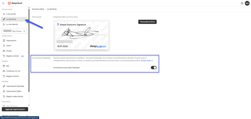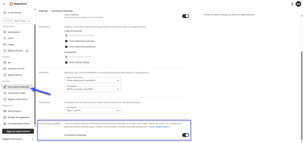 Attivazione l’archiviazione DeepSign