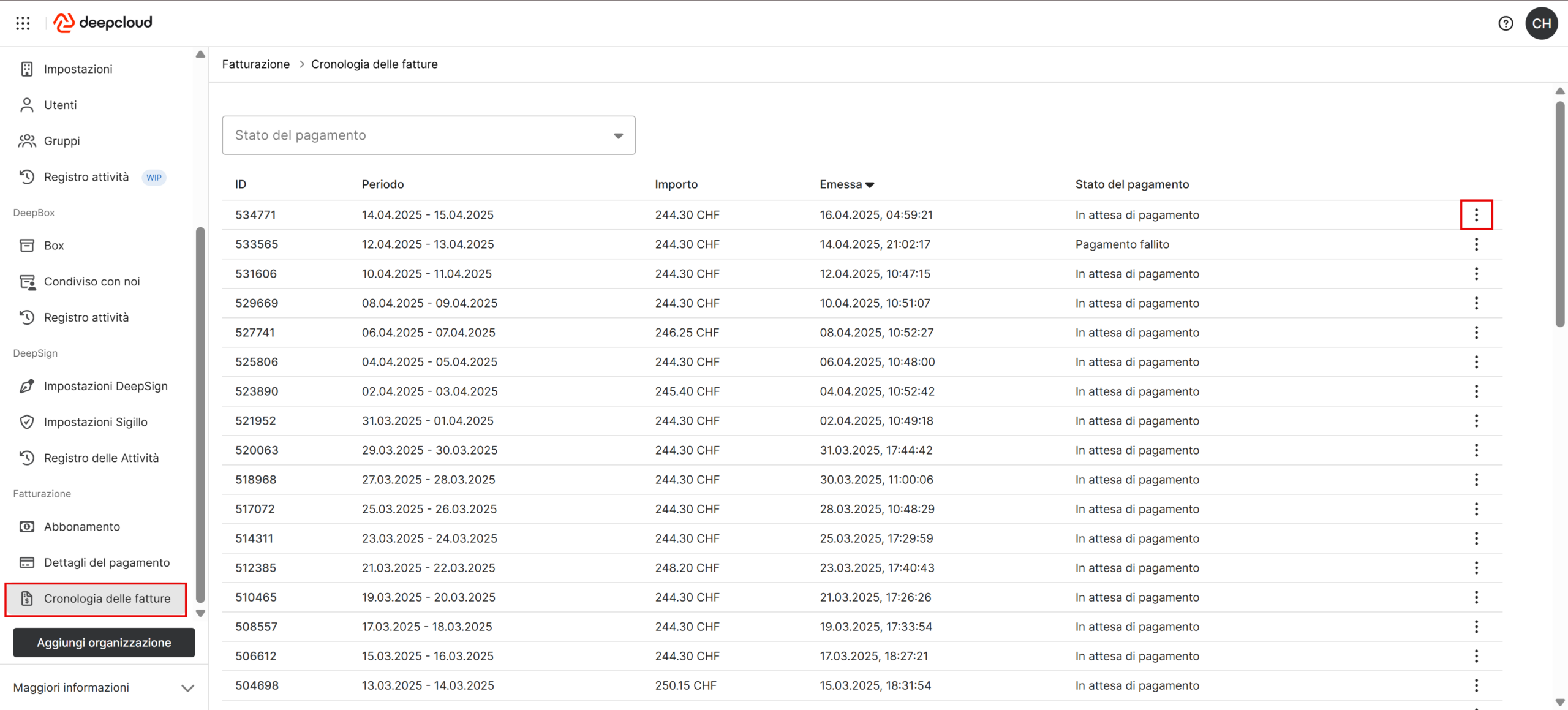 In qualità di proprietario di un’organizzazione, puoi attivare un pagamento insoluto manualmente. Per farlo, accedi alla gestione dell’account all’indirizzo “Cronologia delle fatture”.