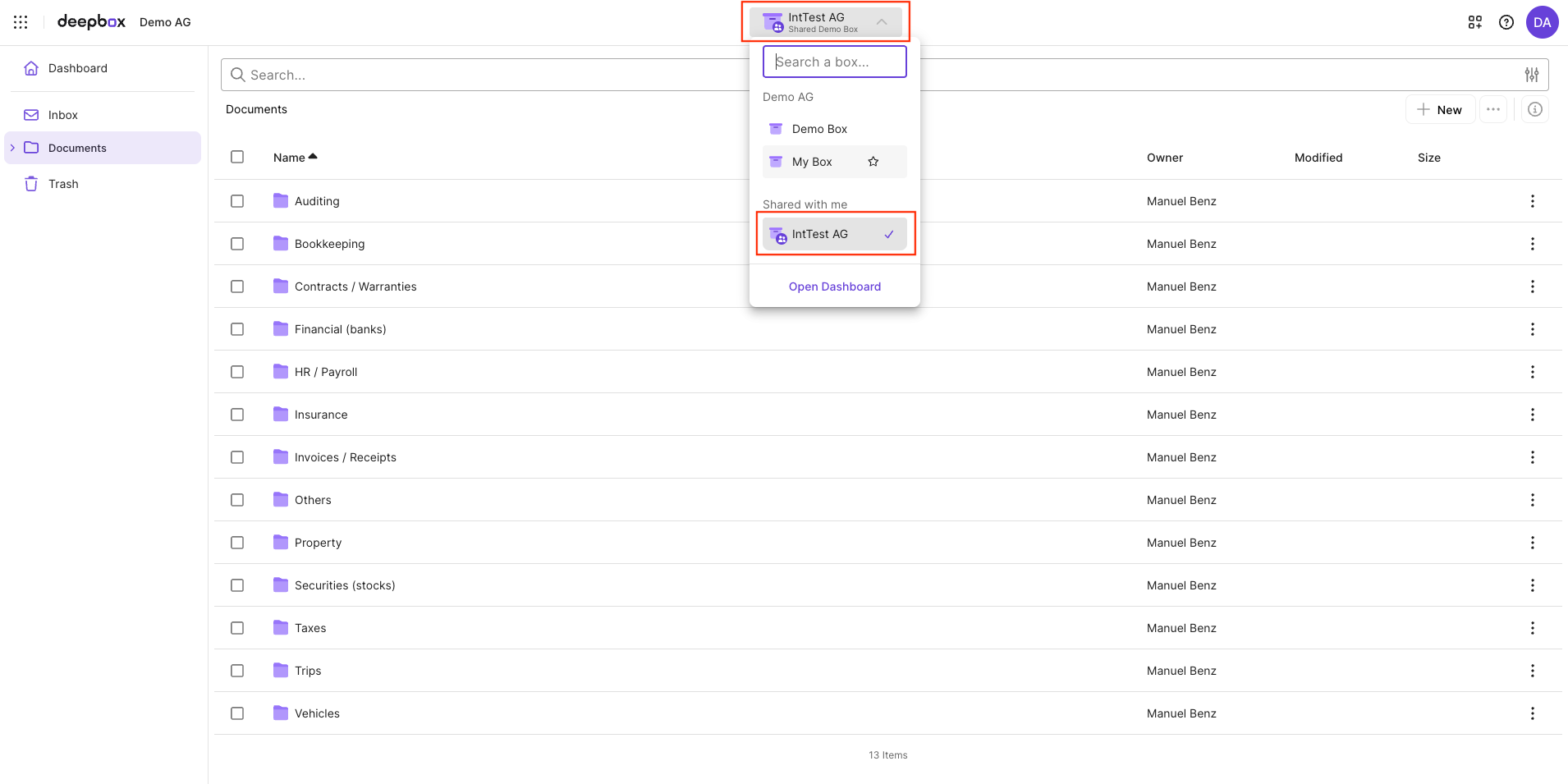 La sezione « Condiviso con me » mostra tutte le box che sono state condivise con lei da organizzazioni esterne. Viene visualizzata automaticamente non appena un’utente o un utente di un’altra organizzazione condivide una box con lei e rimane visibile finché ha accesso ad almeno una box esterna. Questa sezione scompare solo quando il suo accesso a tutte le box esterne è stato revocato.