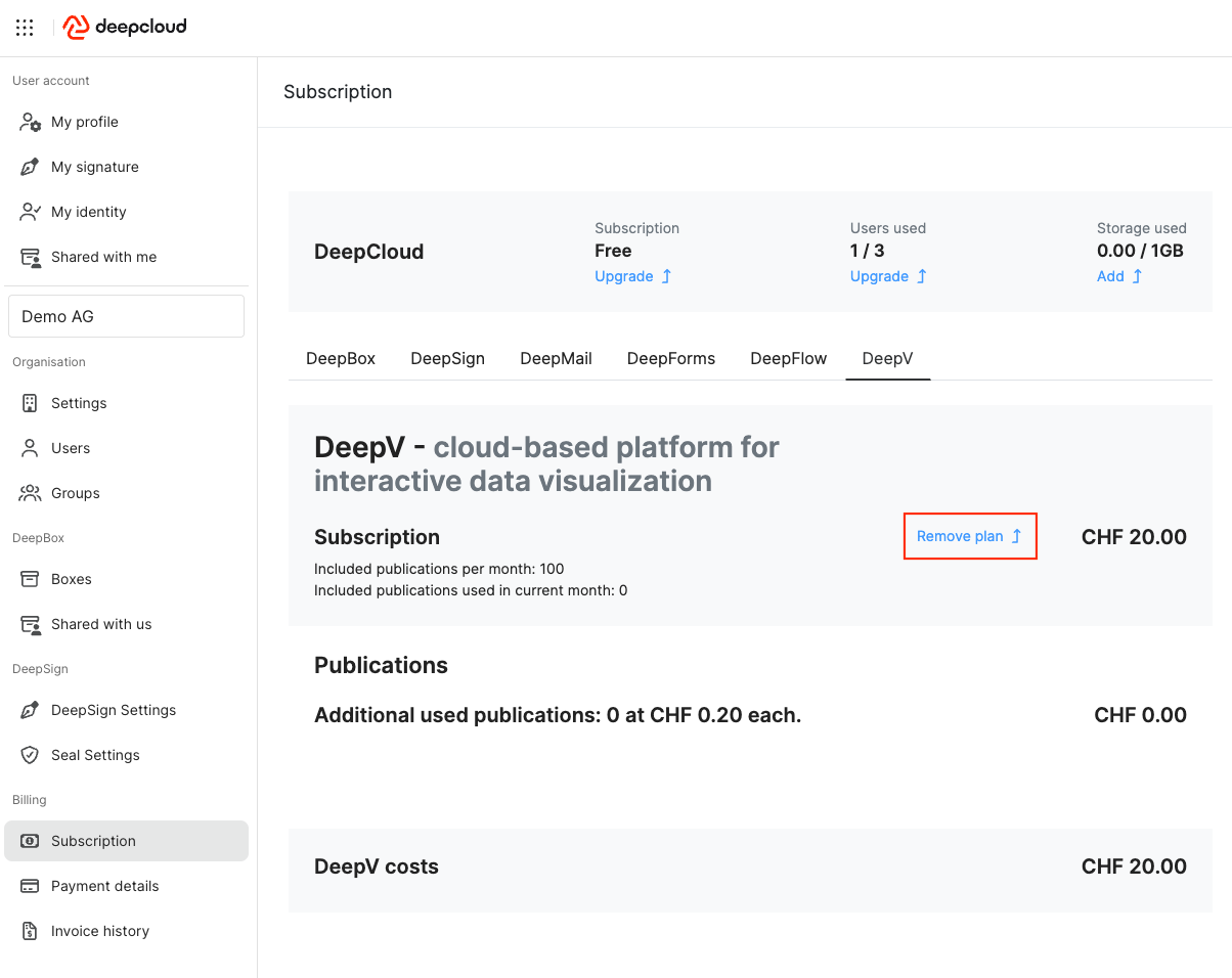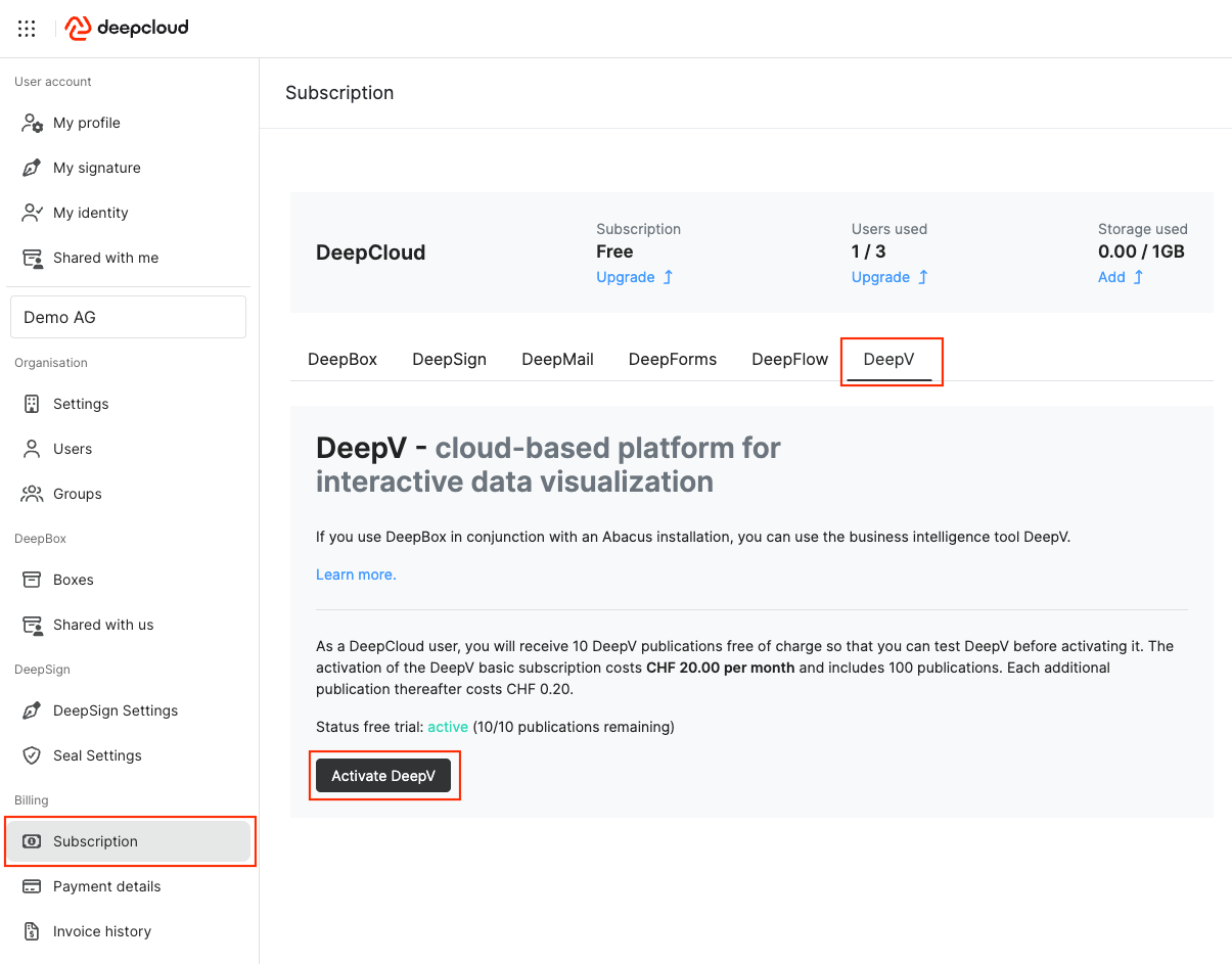 Nella gestione dell’account (DeepAdmin), alla voce di menu «Abbonamento» può attivare autonomamente un abbonamento DeepV. A scopo di test, inizialmente sono a sua disposizione 10 pubblicazioni gratuite. L’abbonamento DeepV comprende 100 pubblicazioni; ogni pubblicazione aggiuntiva viene addebitata a 0.20 CHF. I passaggi successivi corrispondono alla procedura descritta per la modifica dell’abbonamento.