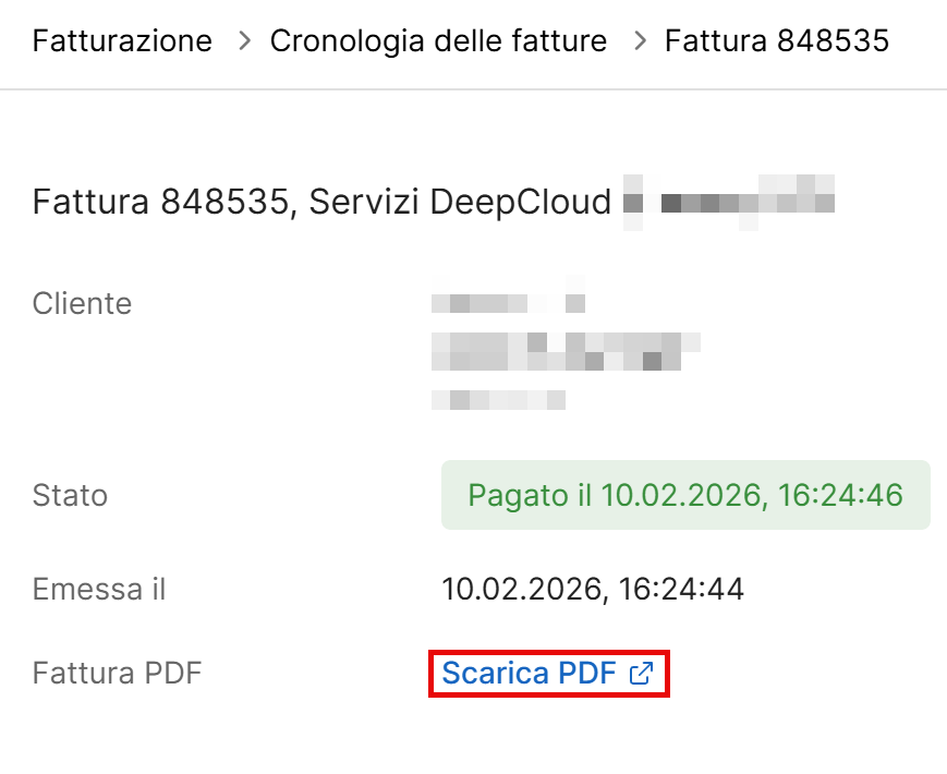 Nella gestione del conto, le fatture sono disponibili nella sezione “Cronologia delle fatture”. Cliccando sui tre punti verticali, è possibile visualizzare e scaricare la fattura in formato PDF.