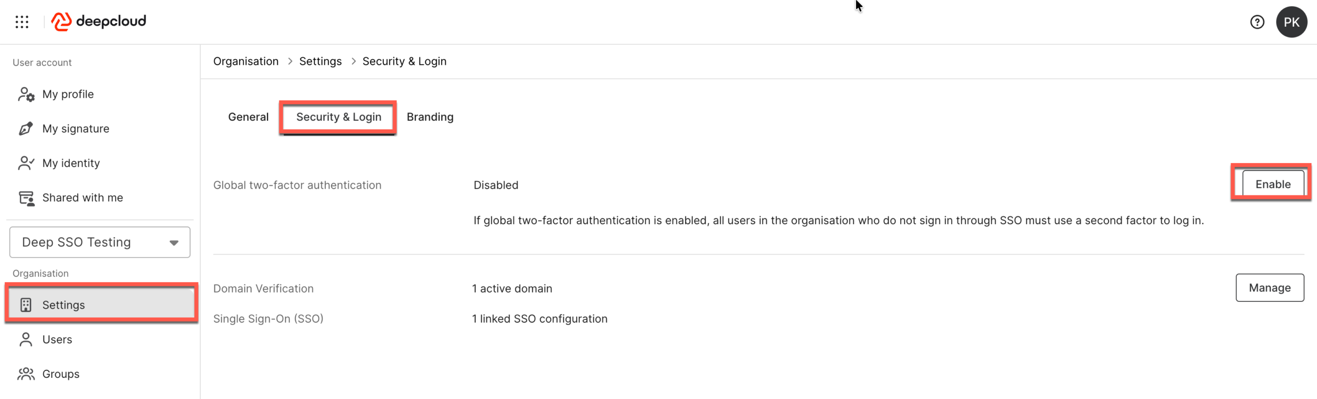 Come owner di un’organizzazione, può anche abilitare l’autenticazione a due fattori globale. Quando questa opzione è attivata, l’autenticazione a due fattori è obbligatoria per tutti gli utenti dell’organizzazione che non effettuano l’accesso tramite Single Sign-On (SSO).
